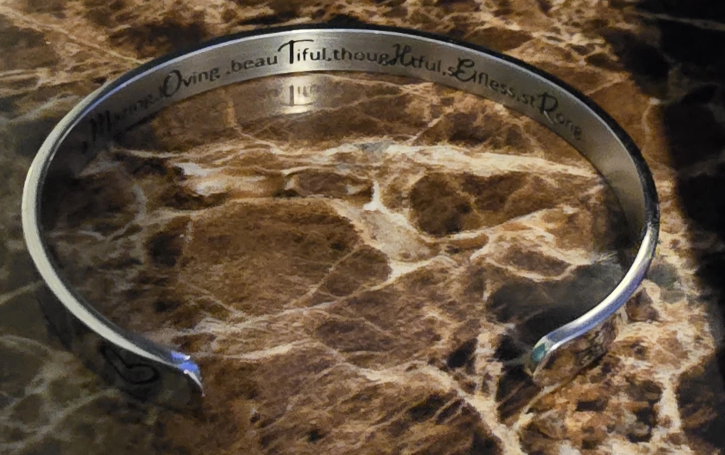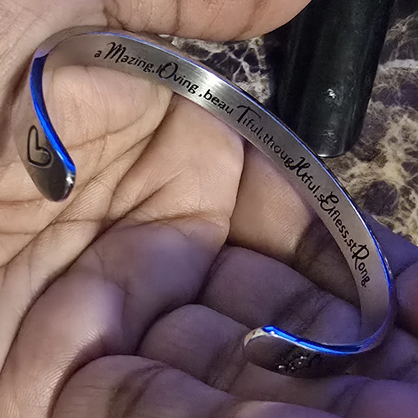 This silver-tone cuff bracelet has an engraved quote: 'aMazing. LOving. beauTiful, thougHtful, sElfless. stRong'. It's made of metal. Perfect for anyone who appreciates unique jewelry!
