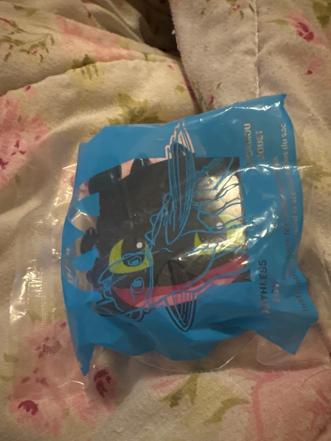 This is a sealed McDonald's Happy Meal toy featuring Toothless from How To Train Your Dragon. It's in its original packaging. It's a fun collectible for fans of the movie franchise!