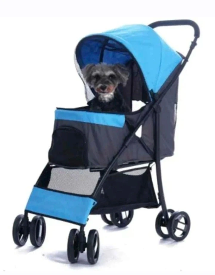 This pet stroller is blue and grey. It has a canopy and a storage basket underneath. It's great for taking smaller pets on walks or to appointments.