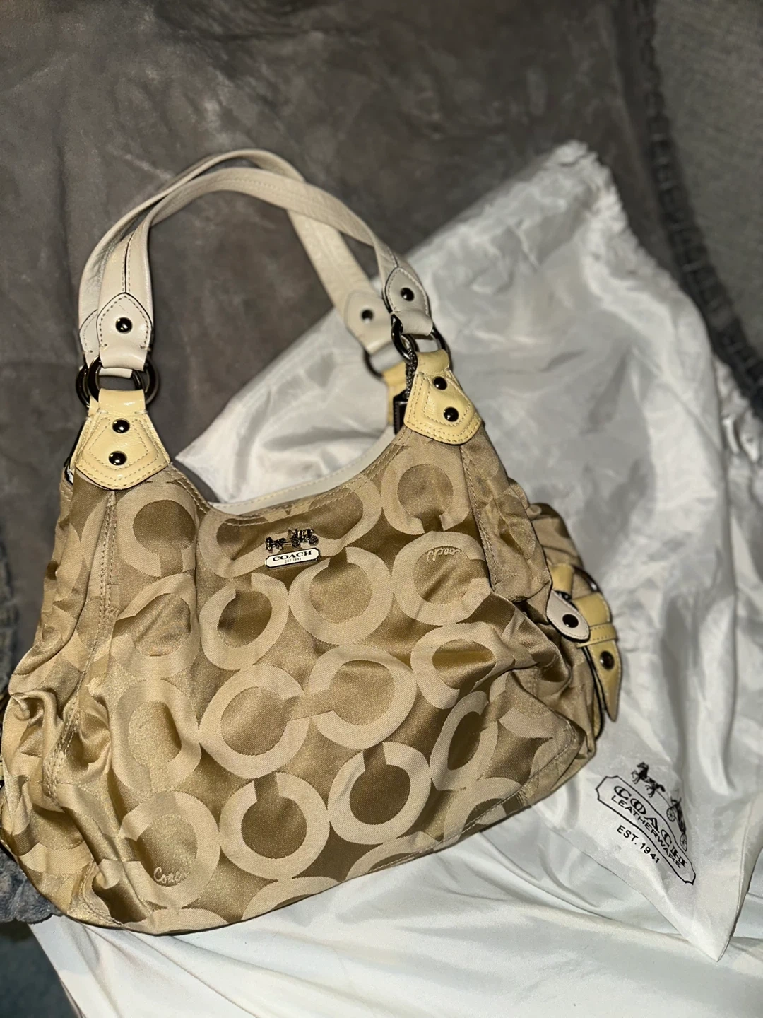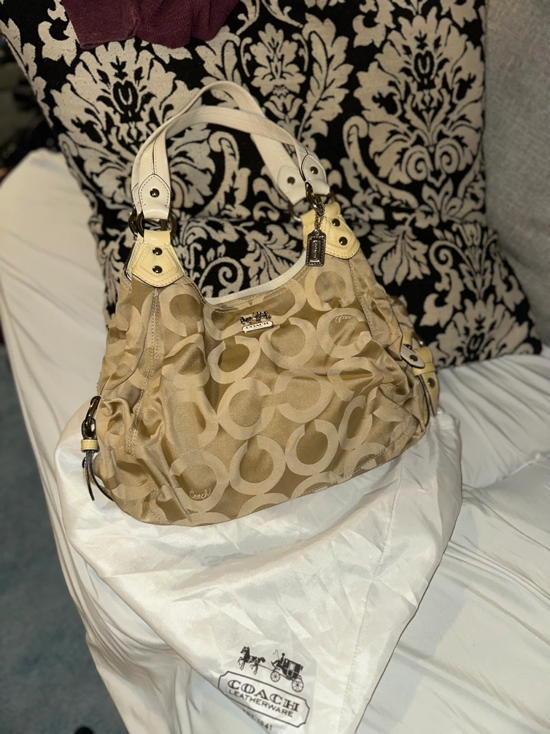 This Coach hobo bag features the signature monogram pattern. It has cream leather accents and a vibrant orange lining. Includes two small leather hang tags. No signs of wear.