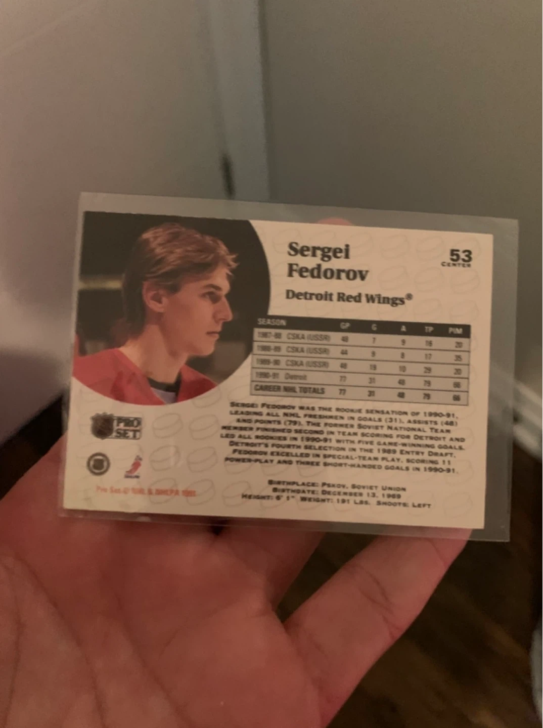 Selling a Sergei Fedorov hockey card from the Detroit Red Wings. It's a Pro Set card, featuring action shots and career stats on the back. Great for any hockey fan or collector!