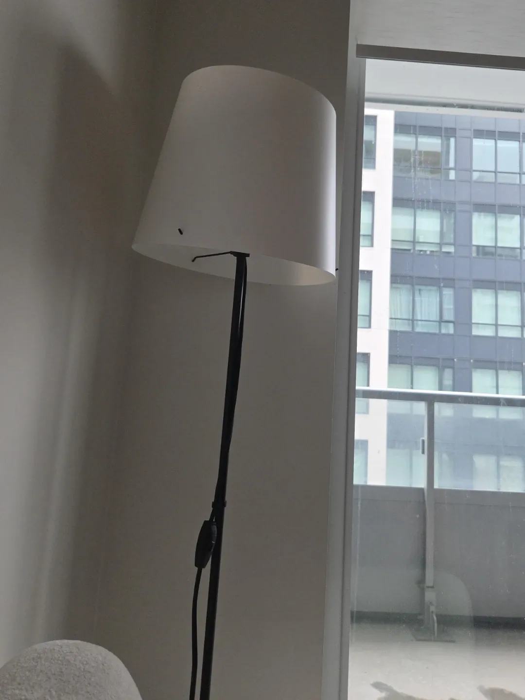 This is a white floor lamp. It has a black pole and a white shade. The lamp has an inline switch on the cord. BRNAD NEW WITH BULB WHICH WORKS ON BLUETOOTH