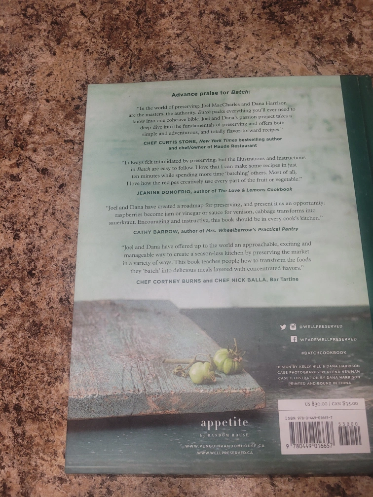 Selling a copy of the "Batch" cookbook by Joel MacCharles & Dana Harrison! It's filled with over 200 recipes, tips, and techniques for a well-preserved kitchen. Design by Kelly Hill & Dana Harrison. Originally priced at $35 CAN