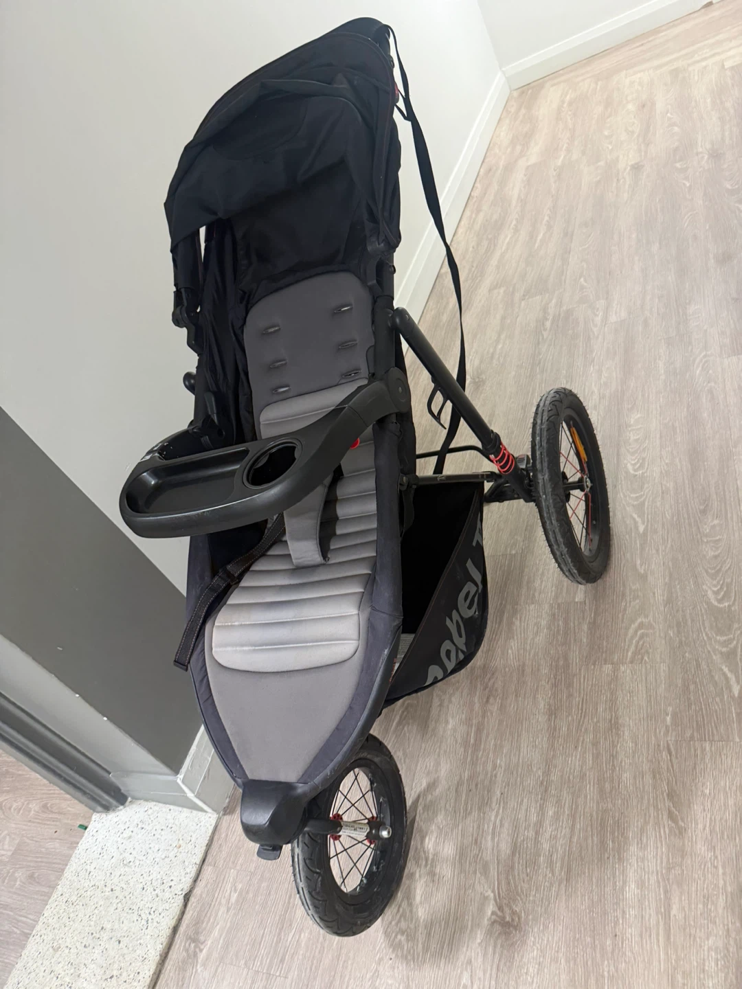 This black and grey Rebel jogging stroller is built for adventure! It features large, air-filled tires for a smooth ride and a comfortable, padded seat. The adjustable handlebar makes it easy to push on any terrain. It's perfect for active parents who want to bring their little ones along for the run!