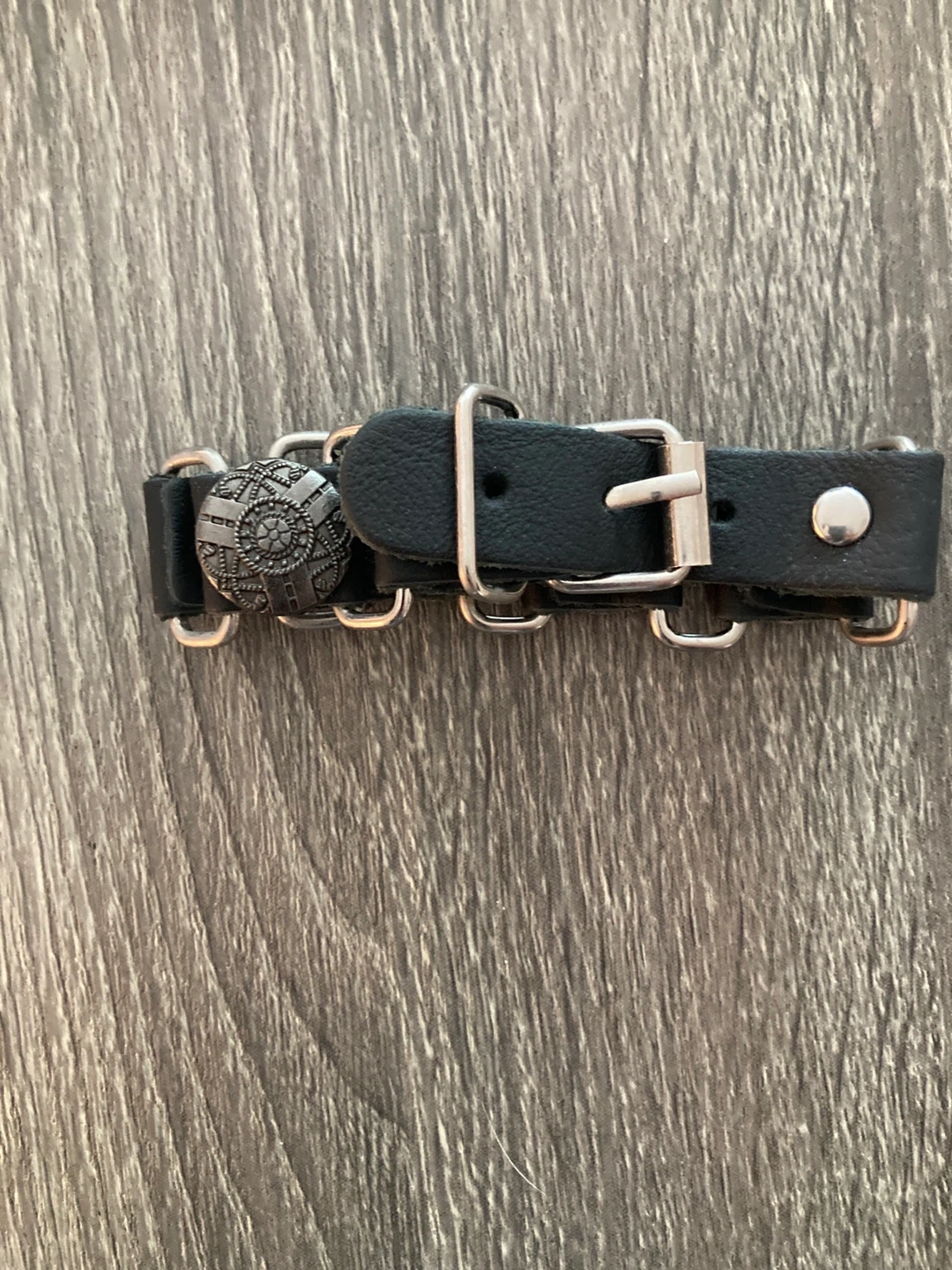 A stylish black leather bracelet featuring decorative silver-toned embellishments. It has an adjustable buckle closure and a snap button for a secure fit. This bracelet adds a touch of western flair to any outfit!