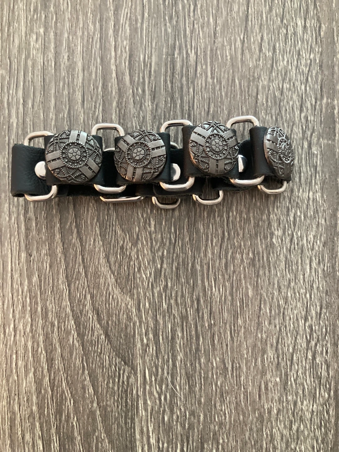 A stylish black leather bracelet featuring decorative silver-toned embellishments. It has an adjustable buckle closure and a snap button for a secure fit. This bracelet adds a touch of western flair to any outfit!