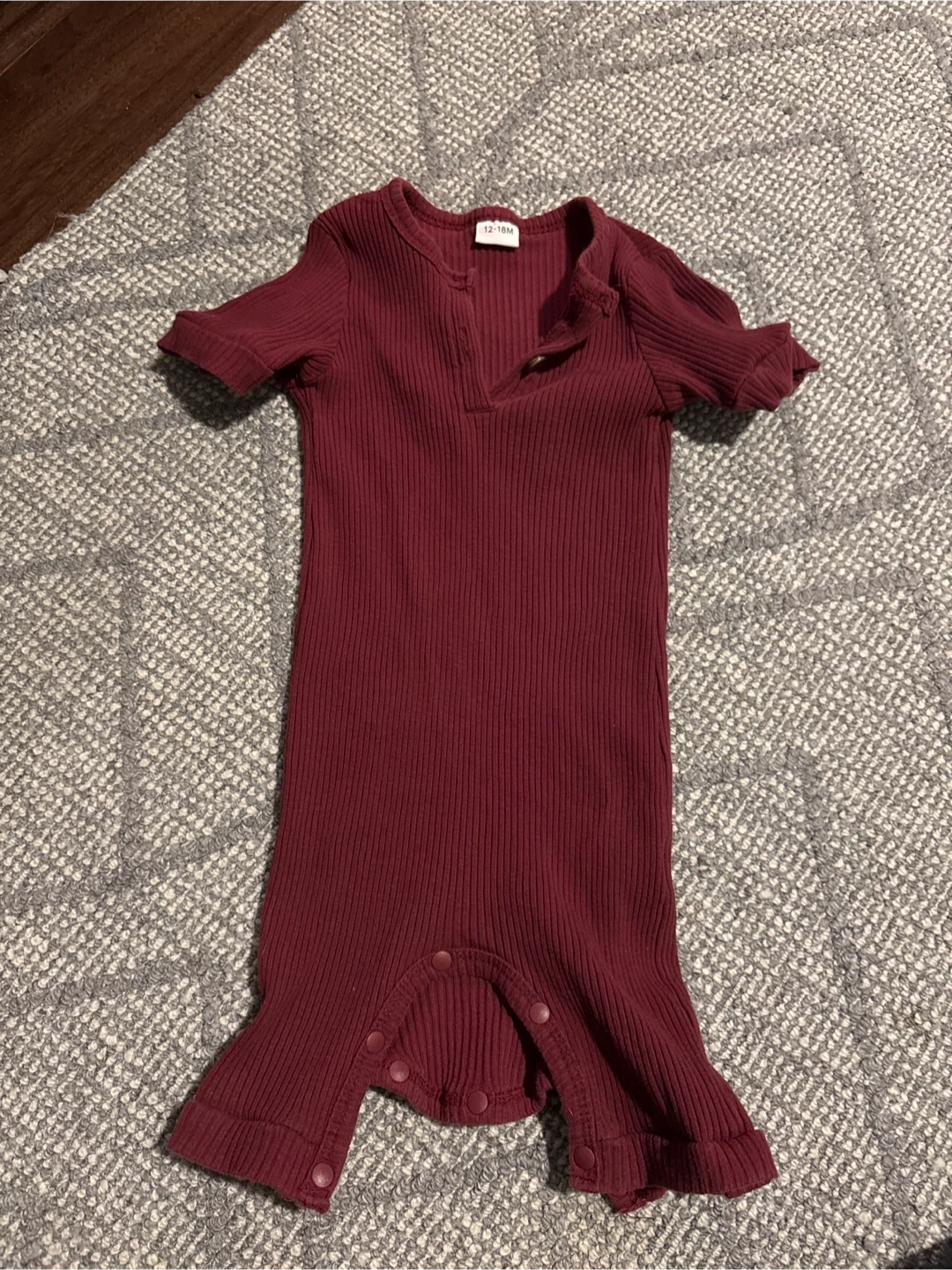 Ribbed burgundy short-sleeve bodysuit for babies. It features a snap closure at the crotch and two buttons at the neckline. Size is 12-18 months.