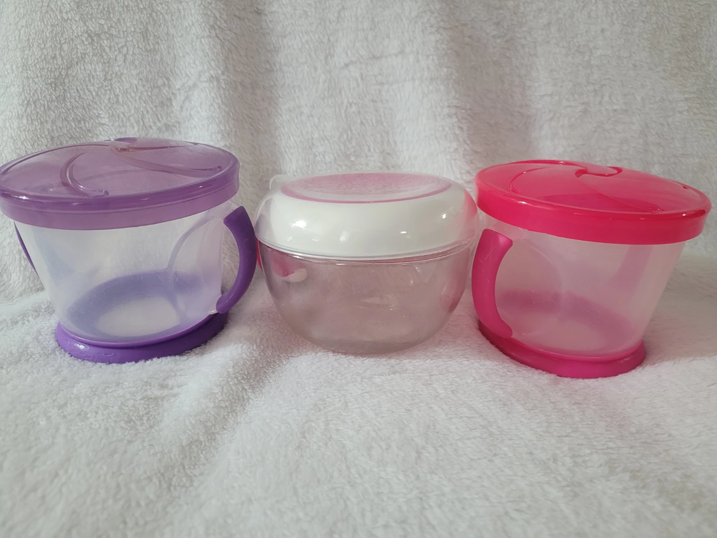 Three colourful snack cups, perfect for little ones to take their snacks on the go. Each cup has a spill-proof lid and easy-grip handles. Made from BPA-free plastic.