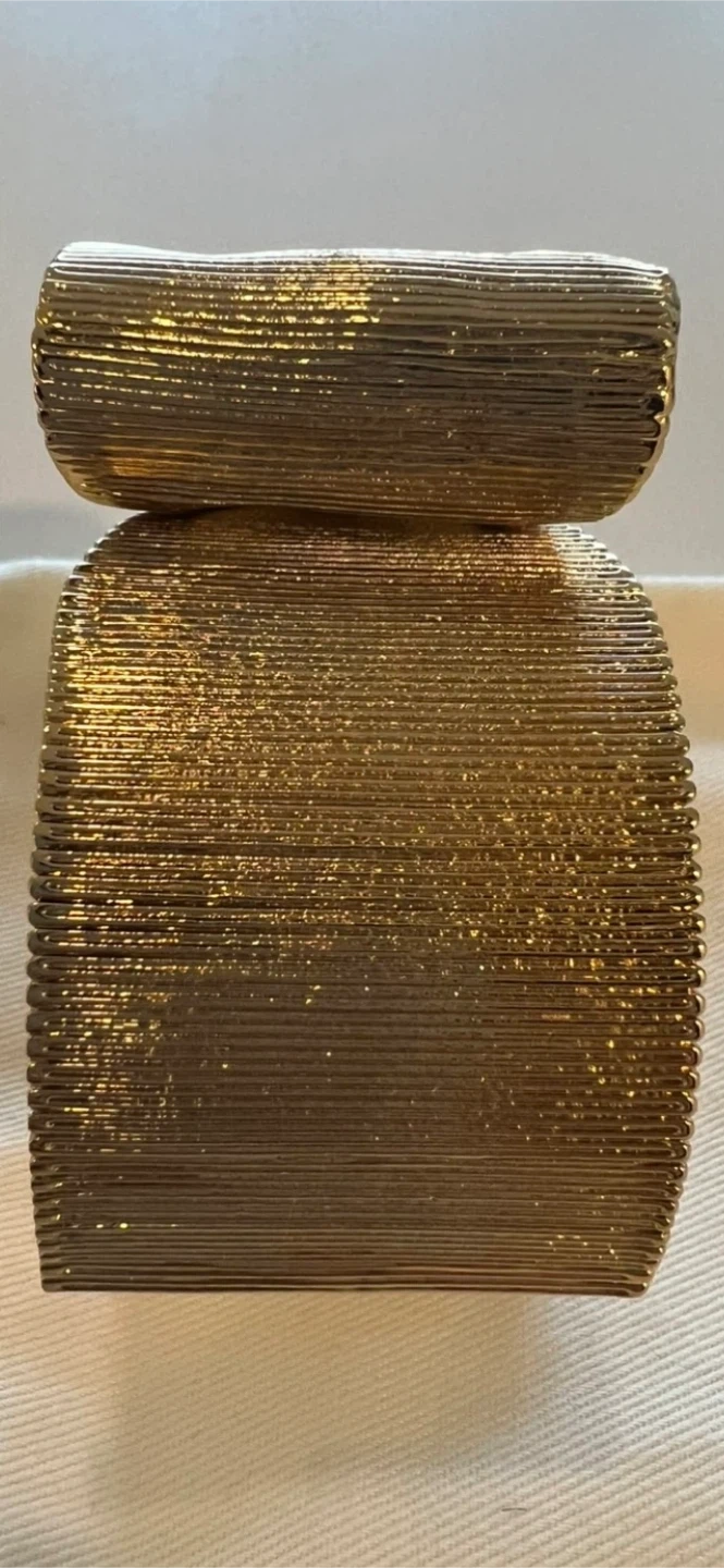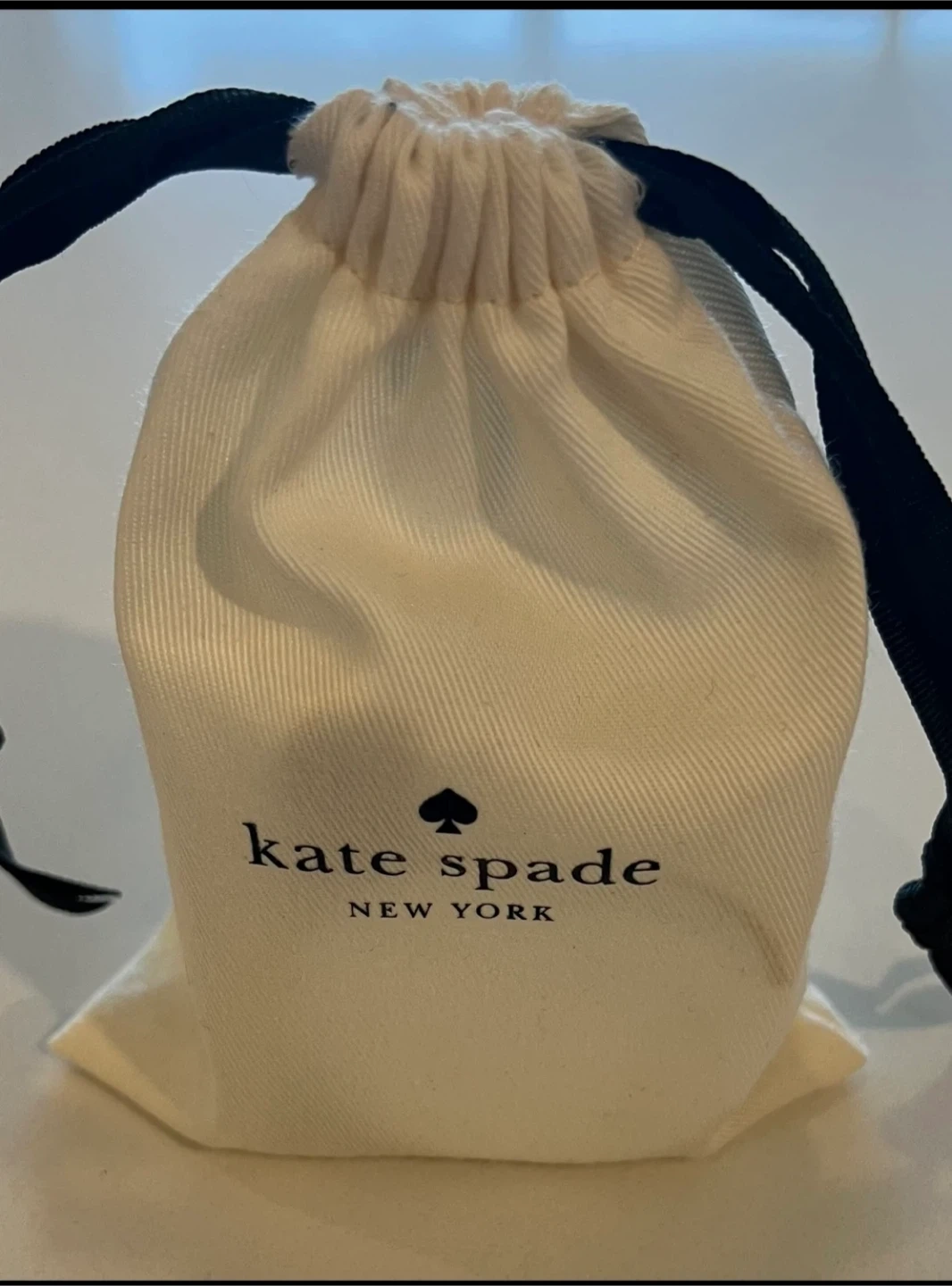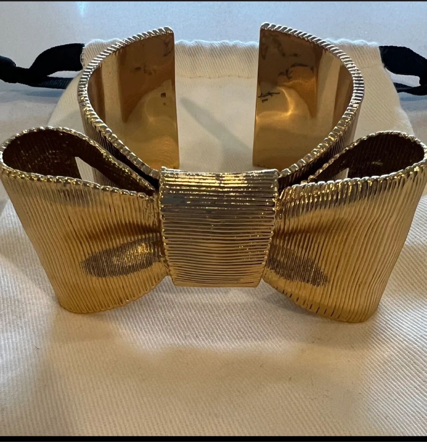 A gold-tone Kate Spade New York cuff bracelet with a bow design. It includes its original dust bag. Measures approximately 2.5 inches in diameter.