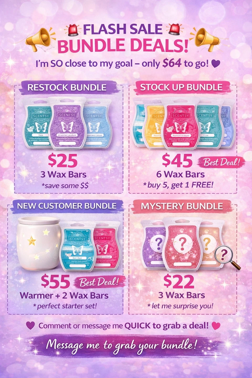Flash sale on Scentsy wax bars and warmers. Choose from Restock Bundles (3 bars for $25), Stock Up Bundles (6 bars for $45), New Customer Bundles (Warmer + 2 bars for $55), or Mystery Bundles (3 bars for $22). Grab a deal before they're gone!