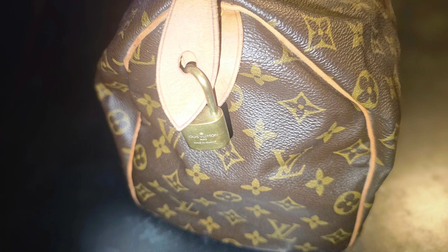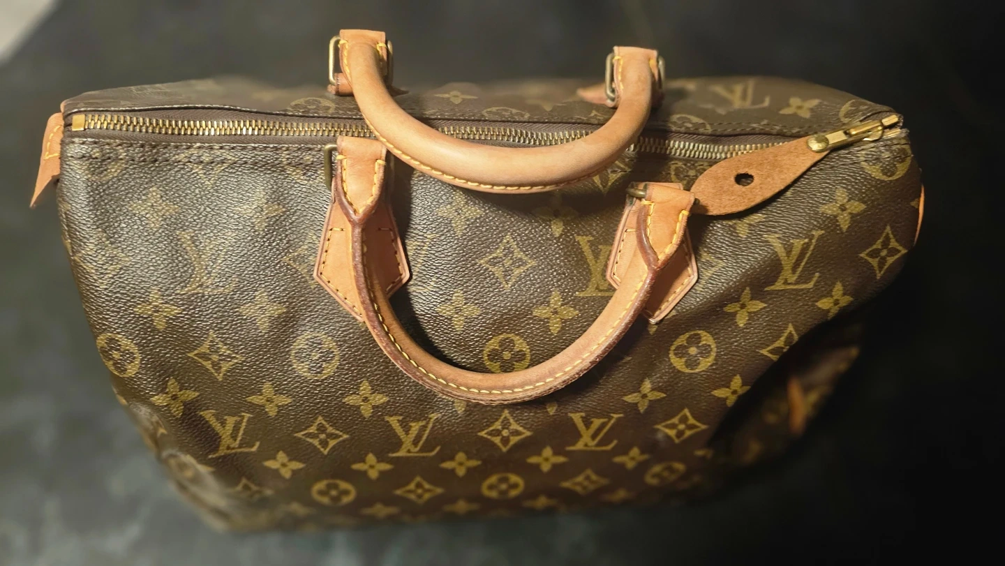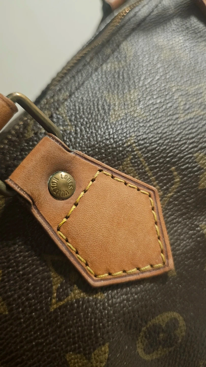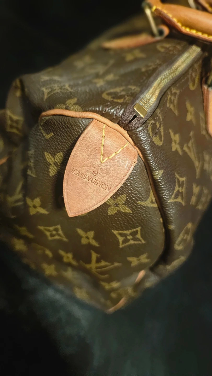 Classic Louis Vuitton Speedy handbag in monogram canvas. Features dual top handles and a zip closure. This iconic bag is a timeless accessory.