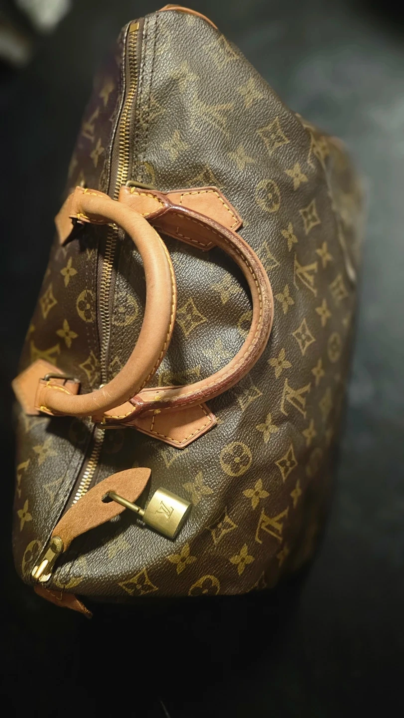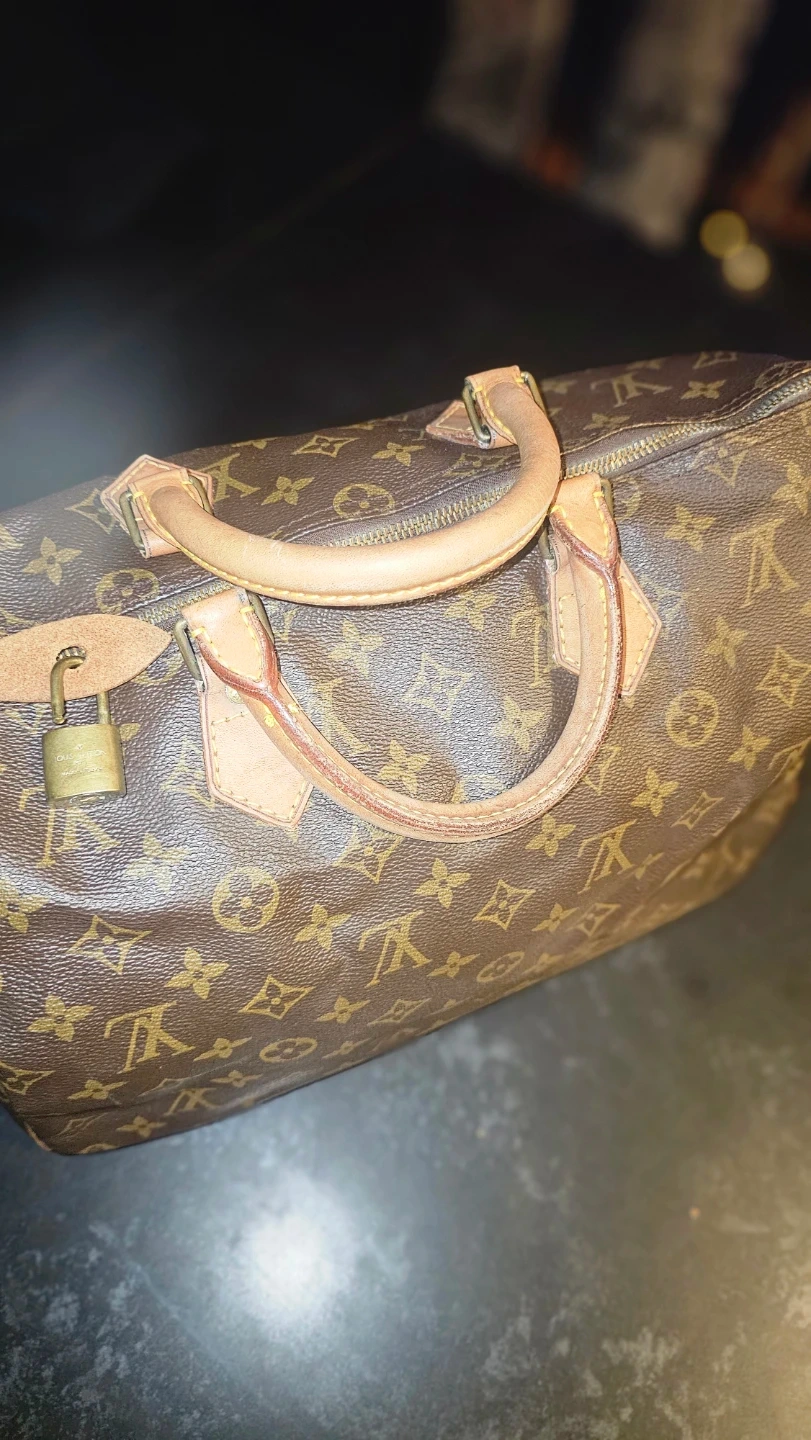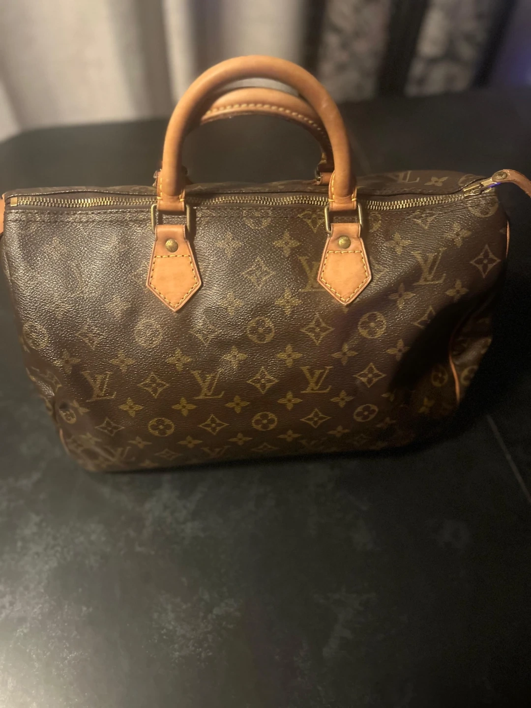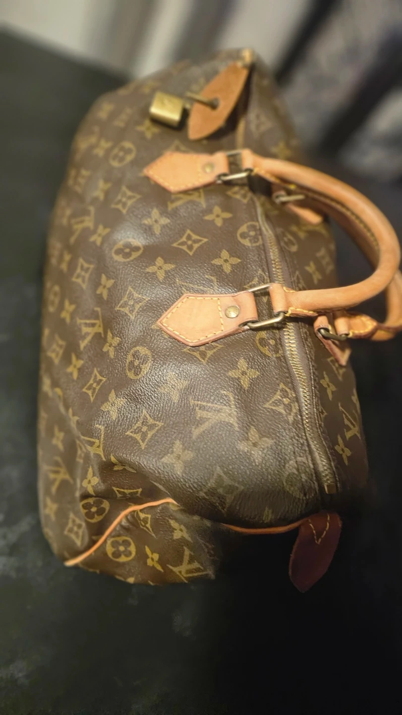Classic Louis Vuitton Speedy handbag in monogram canvas. Features dual top handles and a zip closure. This iconic bag is a timeless accessory.