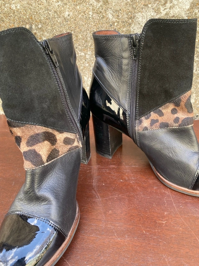 Elevate your shoe collection with these stylish Hispanitas ankle boots, showcasing a blend of leather, suede, and leopard print accents. These pre-owned boots are well-maintained and bring a unique flair to any outfit. Size 37 (approx. US 6.5-7). Add a touch of wild sophistication to your wardrobe.