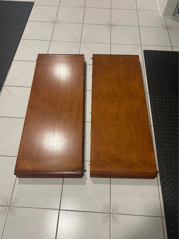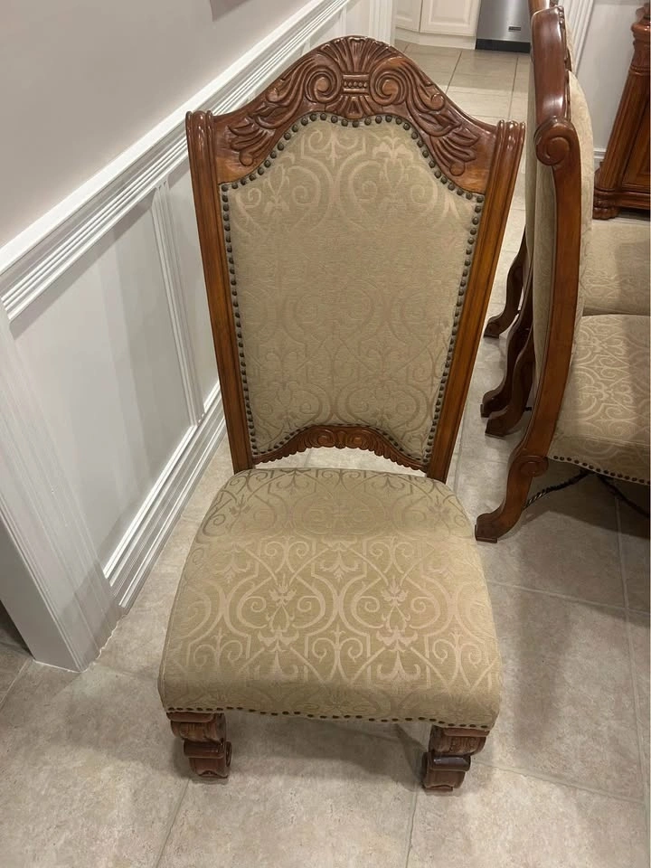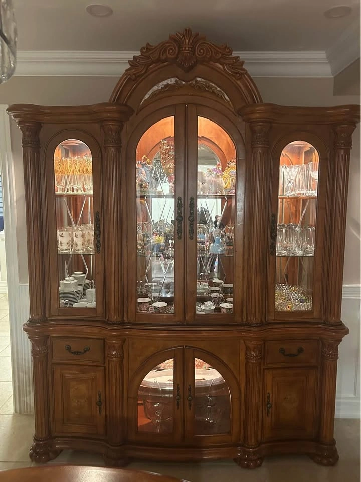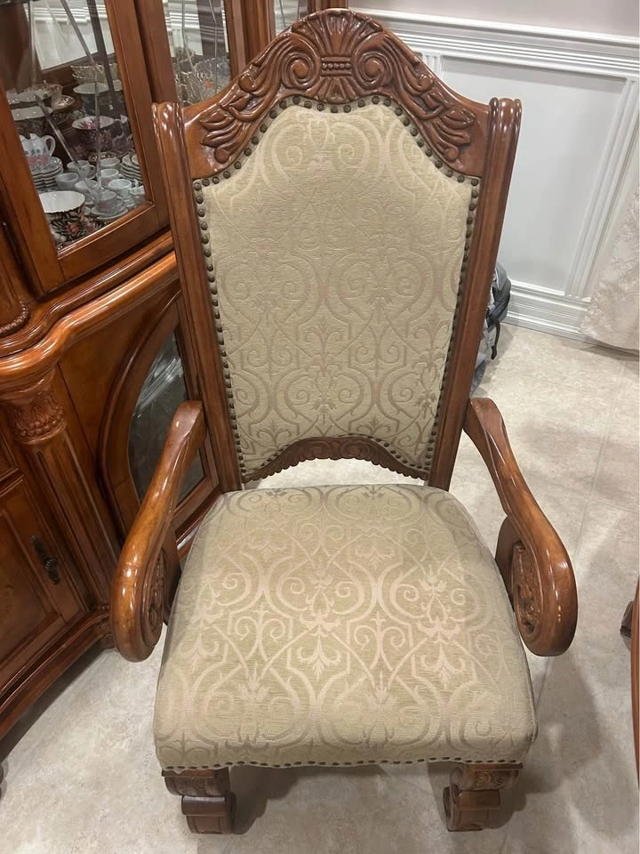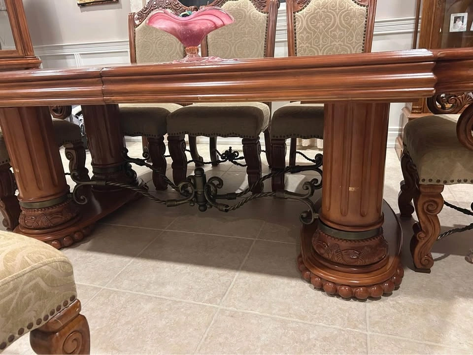 Beautiful wood and iron dining room set with 8 captain's chairs. The table measures 47 inches wide by 85 inches long at its smallest, and includes two 18-inch leaves to extend it. The hutch measures 75 inches wide, 94 inches high, and 19 inches deep, with touch-activated lighting. The set is in very good condition.