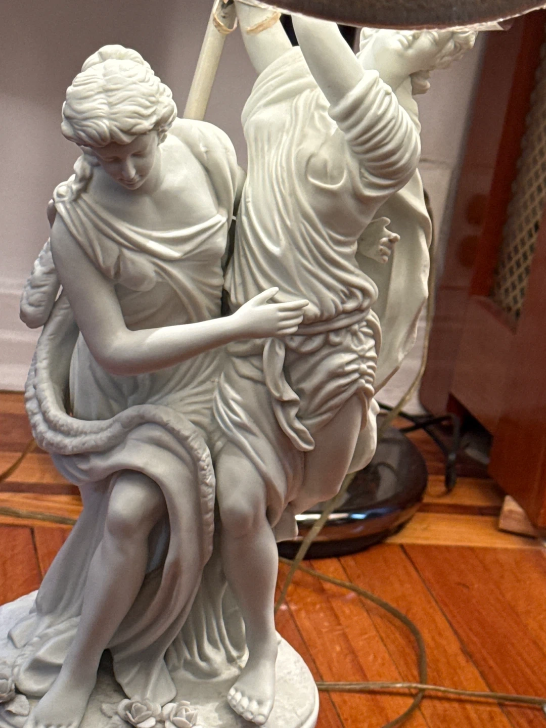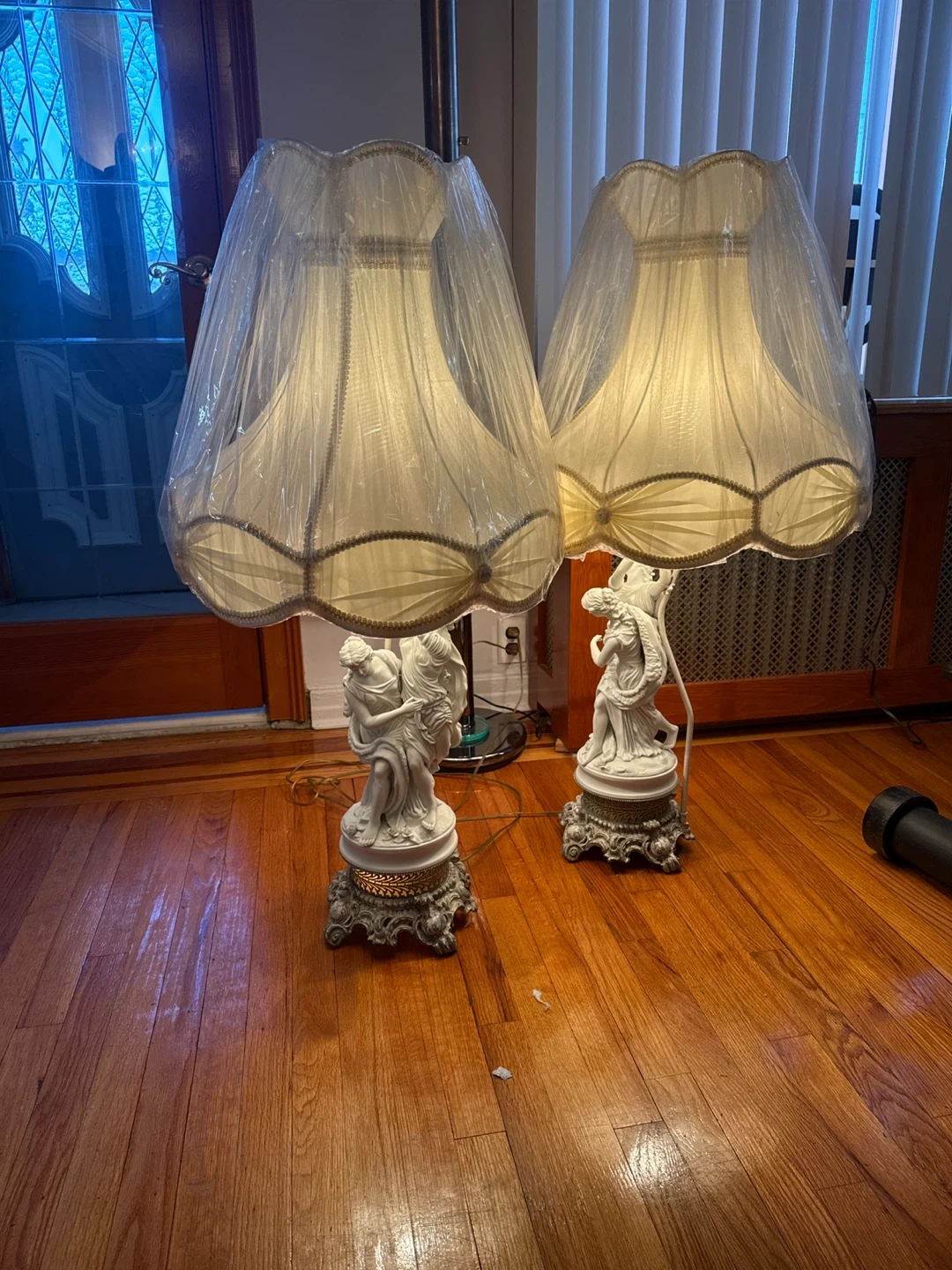 These are a pair of vintage table lamps. Each lamp features Italian marble base with detailed female figurines. They include their original pleated fabric shades and have a decorative illuminated base. They're perfect for adding a touch of classic elegance to any room!