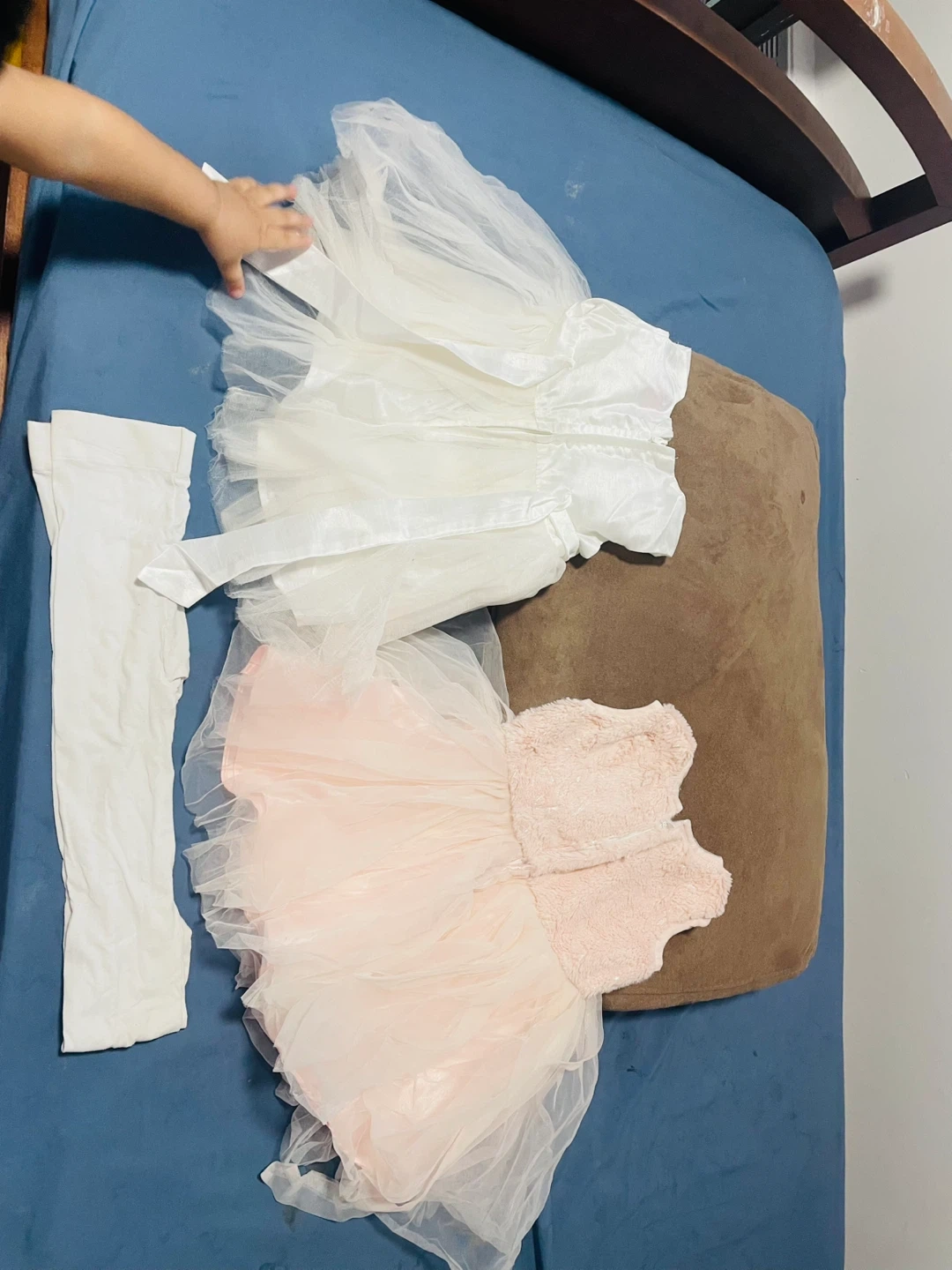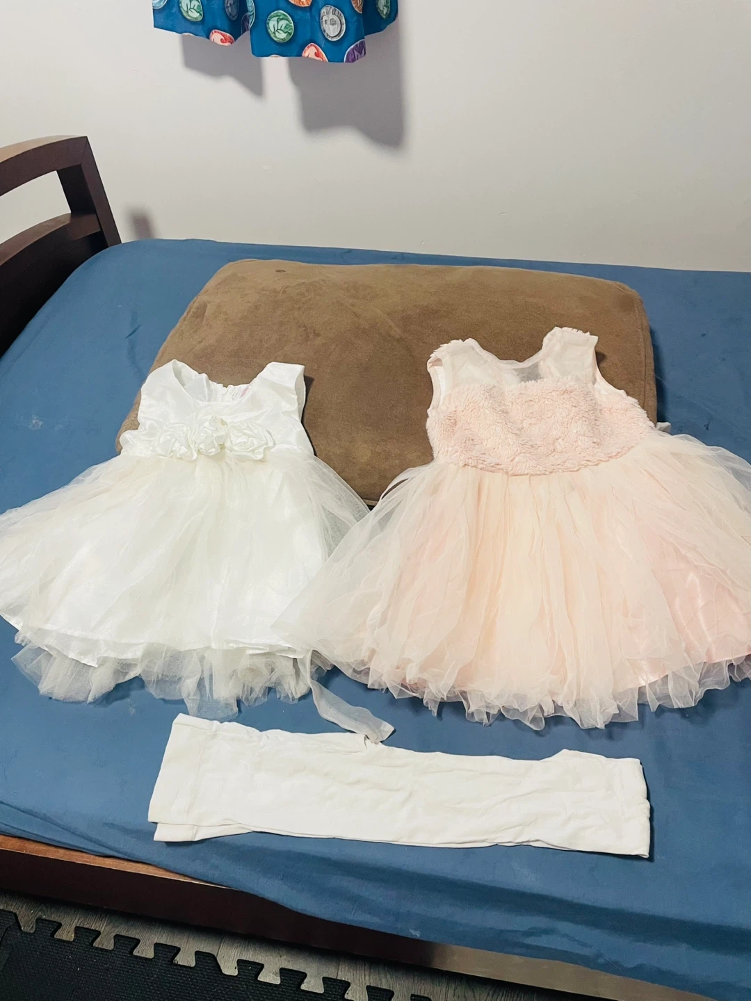 Two cute dresses, one white and one pink, along with a pair of white tights. The white dress has floral accents on the neckline. The pink dress features a velvet bodice and a layered tulle skirt. Perfect for parties or special occasions! Size 12 up to 18 month