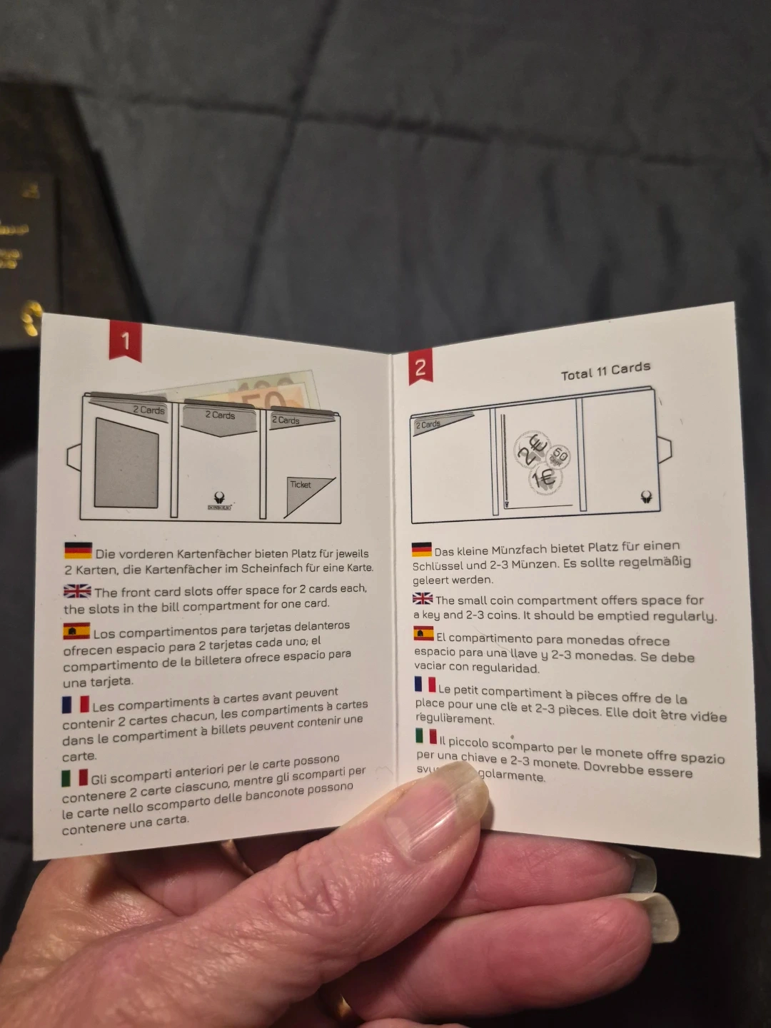 This is a Donbolso Wallety NextGen wallet. It's made with brown suede-like material and features multiple card slots and a coin compartment. Includes original box and instructions.