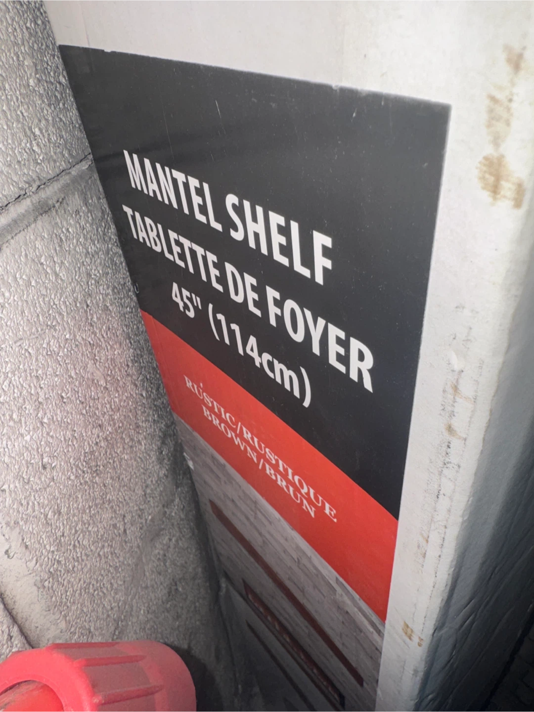 Rustic brown mantel shelf, 45 inches (114cm) long. This shelf has a rustic design. It's a nice piece for your living room!