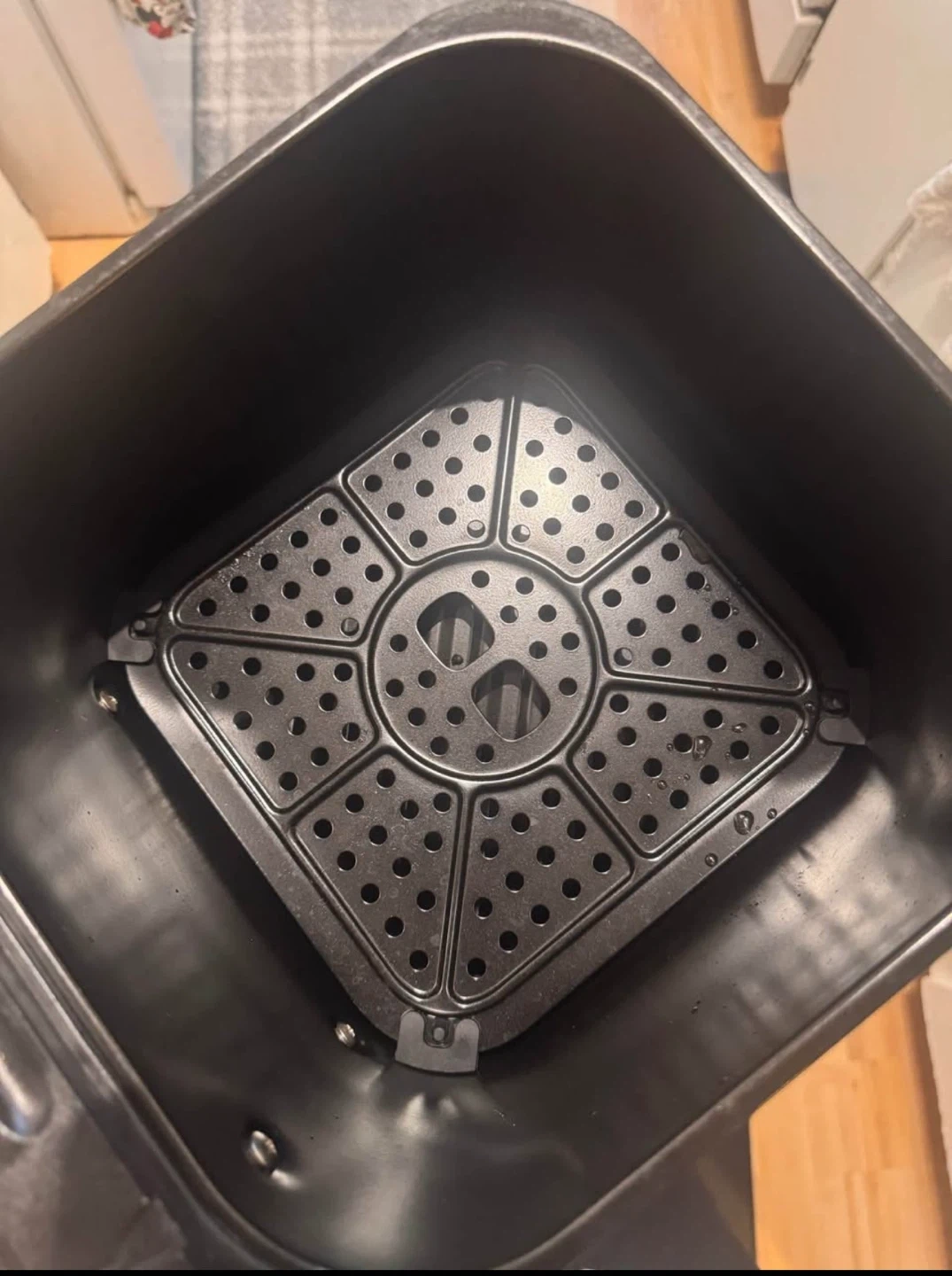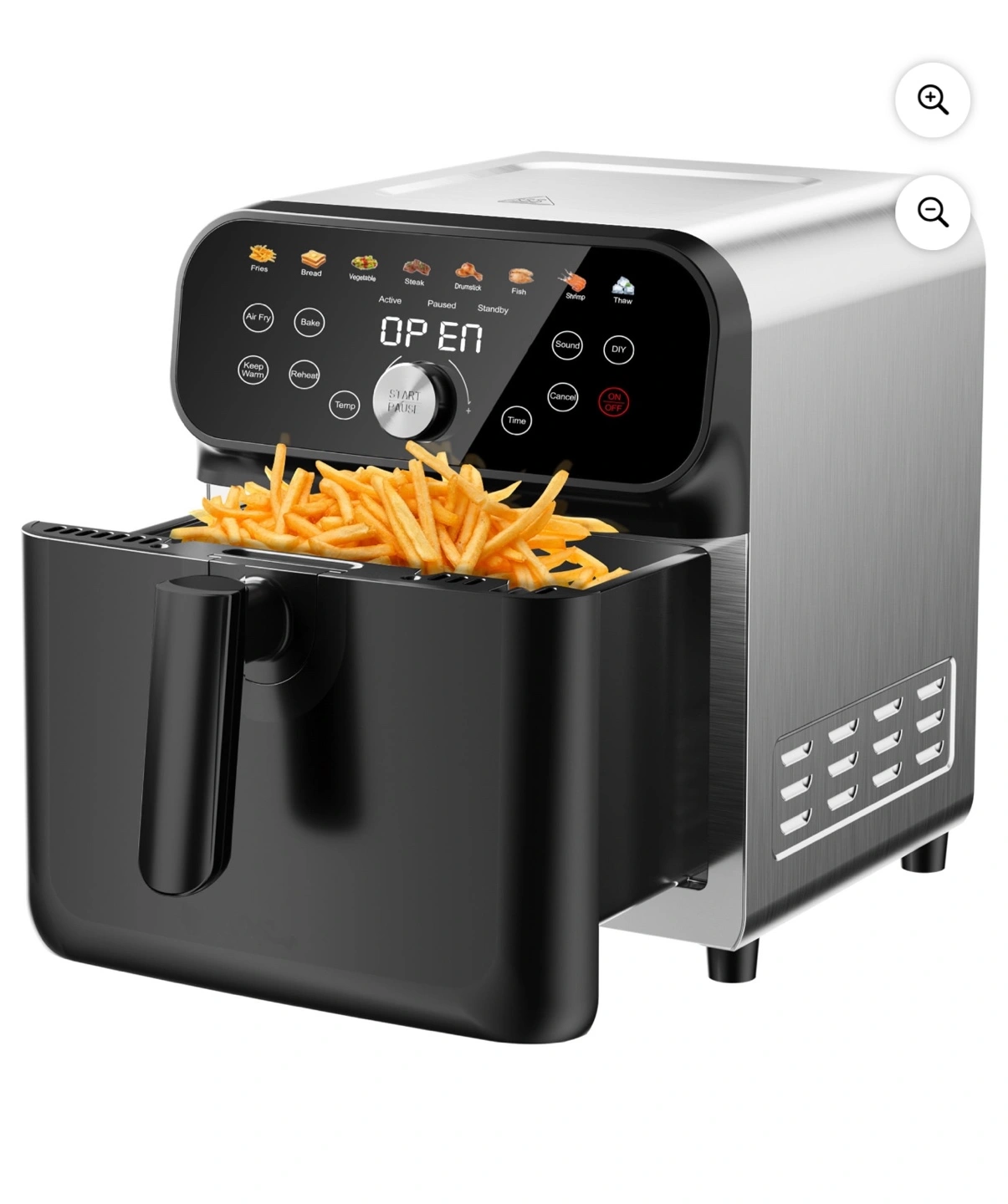 Stainless steel air fryer. Features digital controls and multiple cooking functions. Includes a removable basket.
