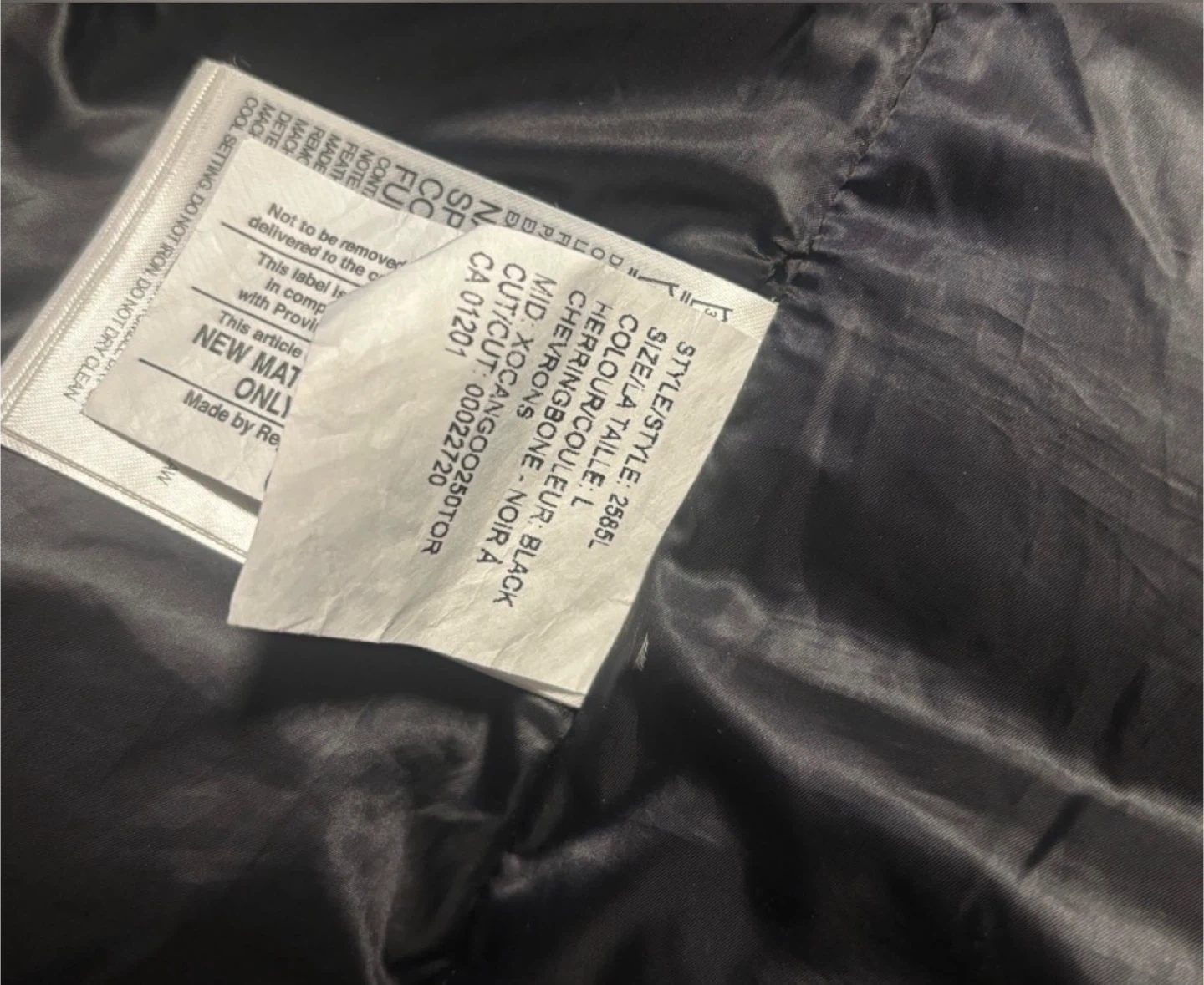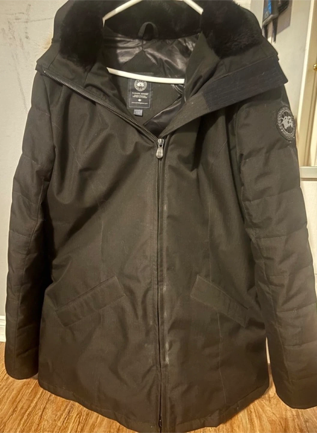 Canada Goose down-filled parka in black. Style is 2885, model name is Mystique. It's a size large and features chevron quilting. Fur-lined hood for extra warmth. This costs around $1k+