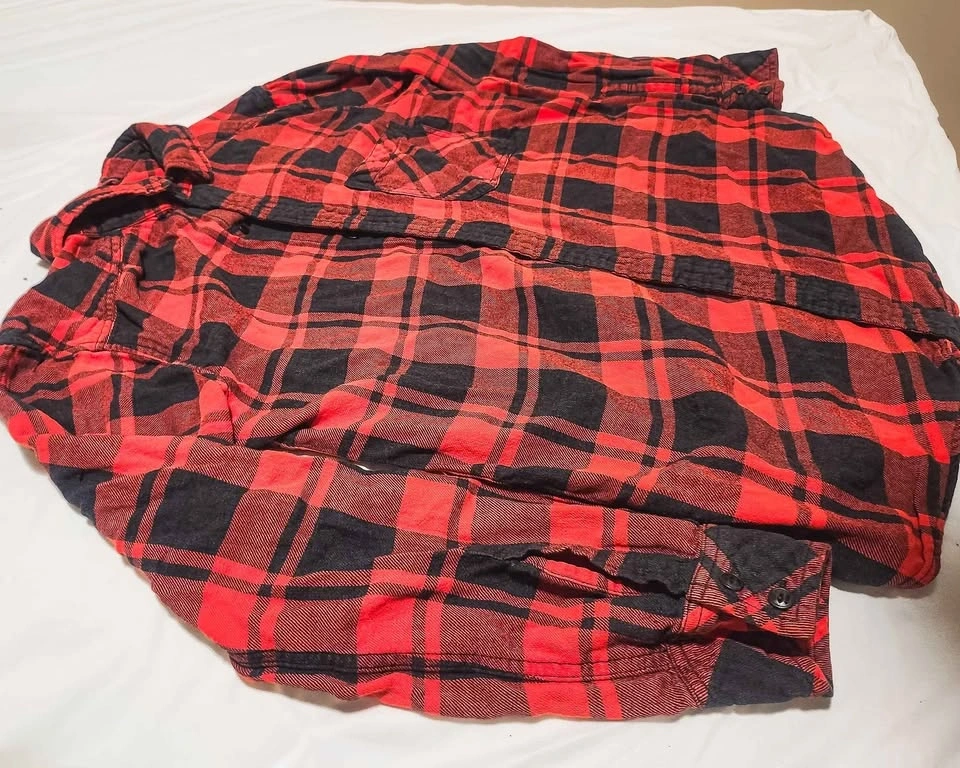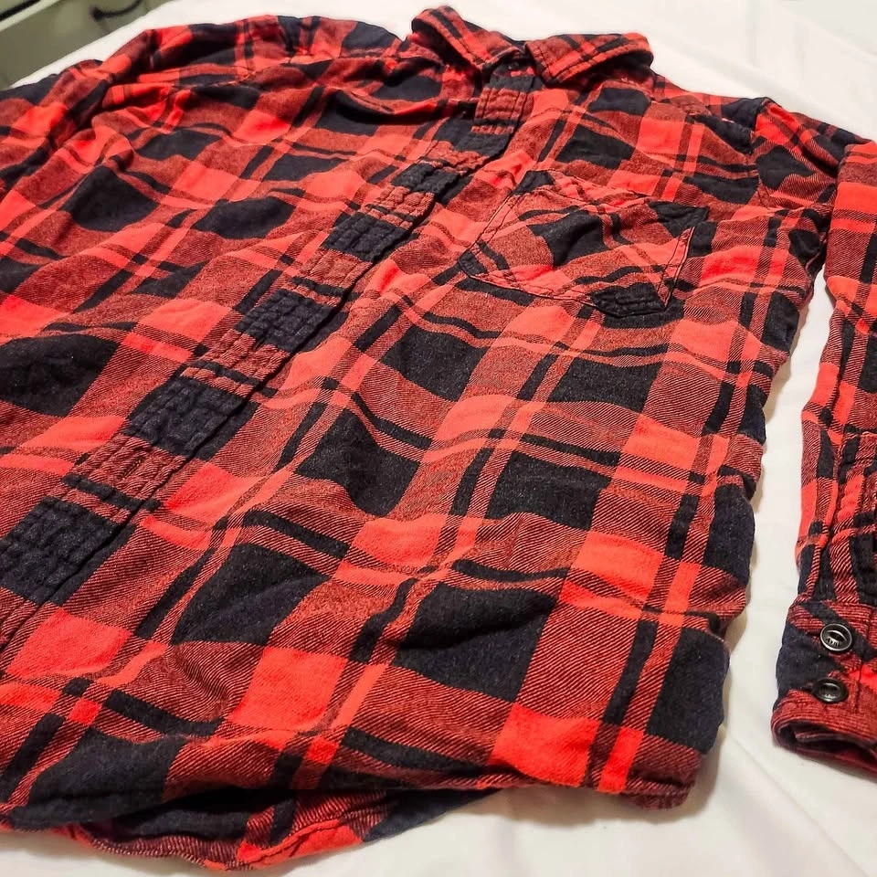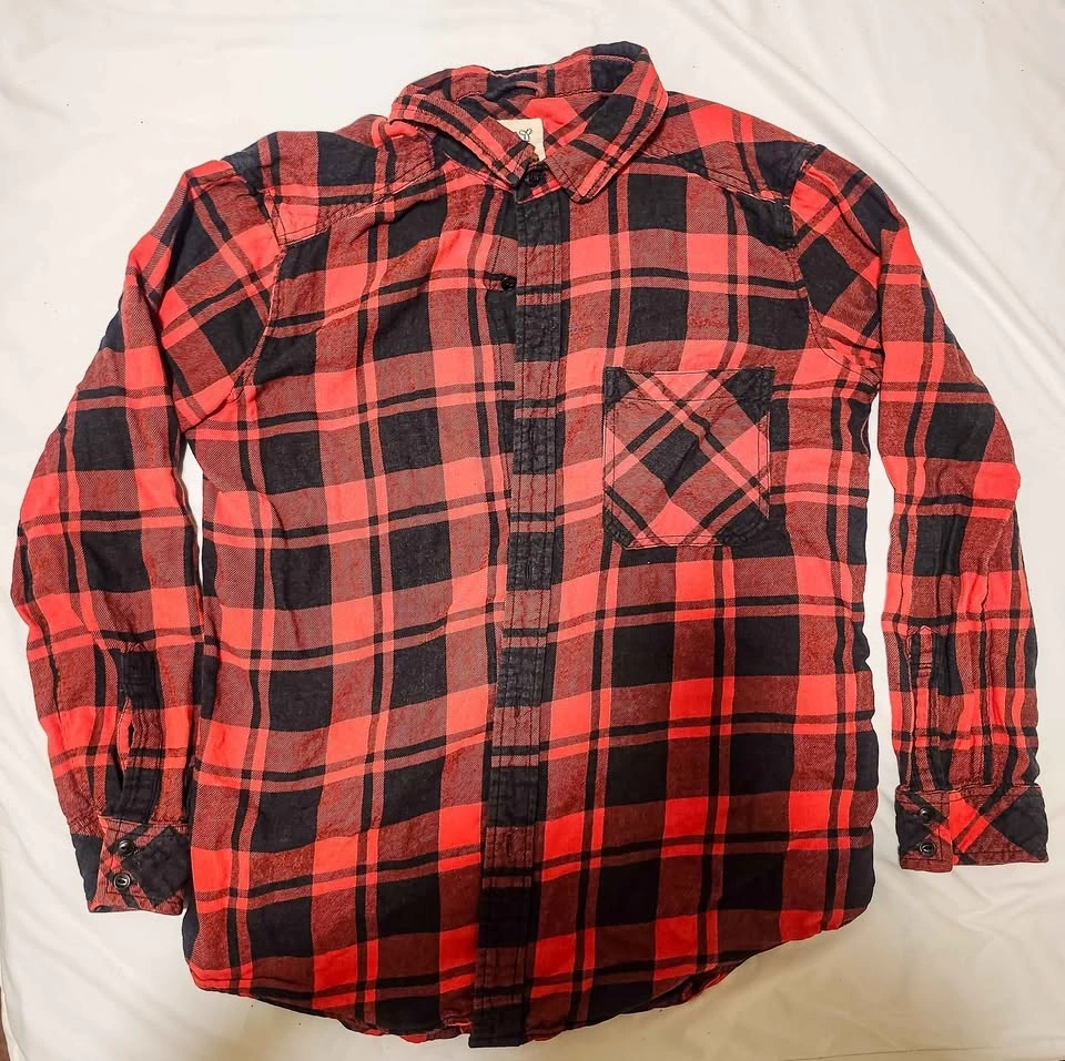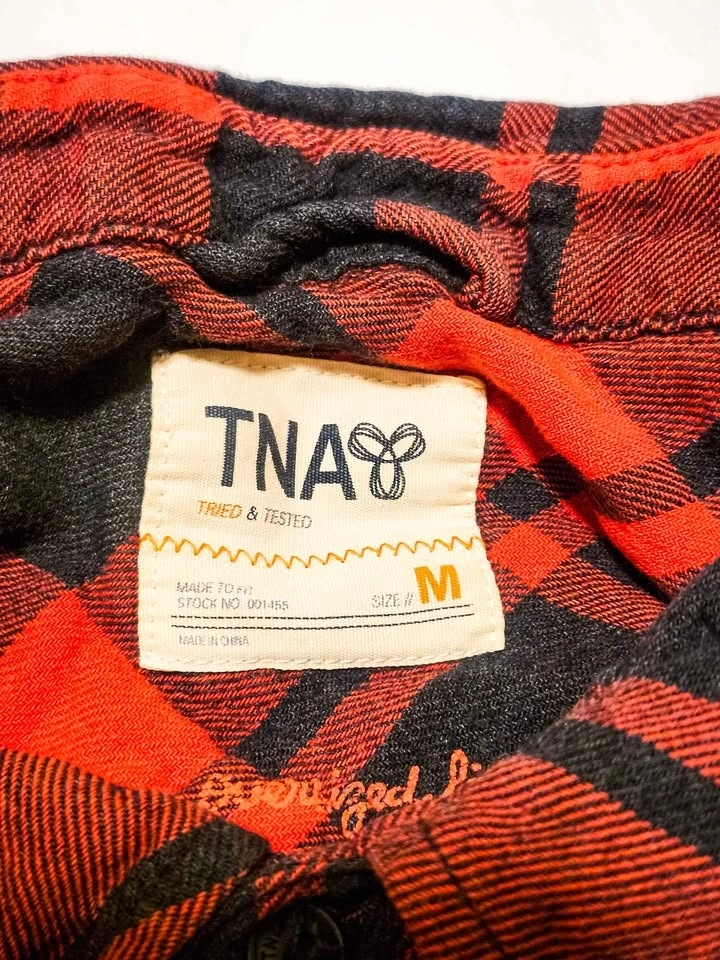 Classic TNA button-down flannel in a red and black buffalo check pattern. Standard fit in a mid-weight 100% cotton fabric. Excellent condition, barely worn. No pilling, stains, or signs of wear. From a smoke-free, pet-free home.