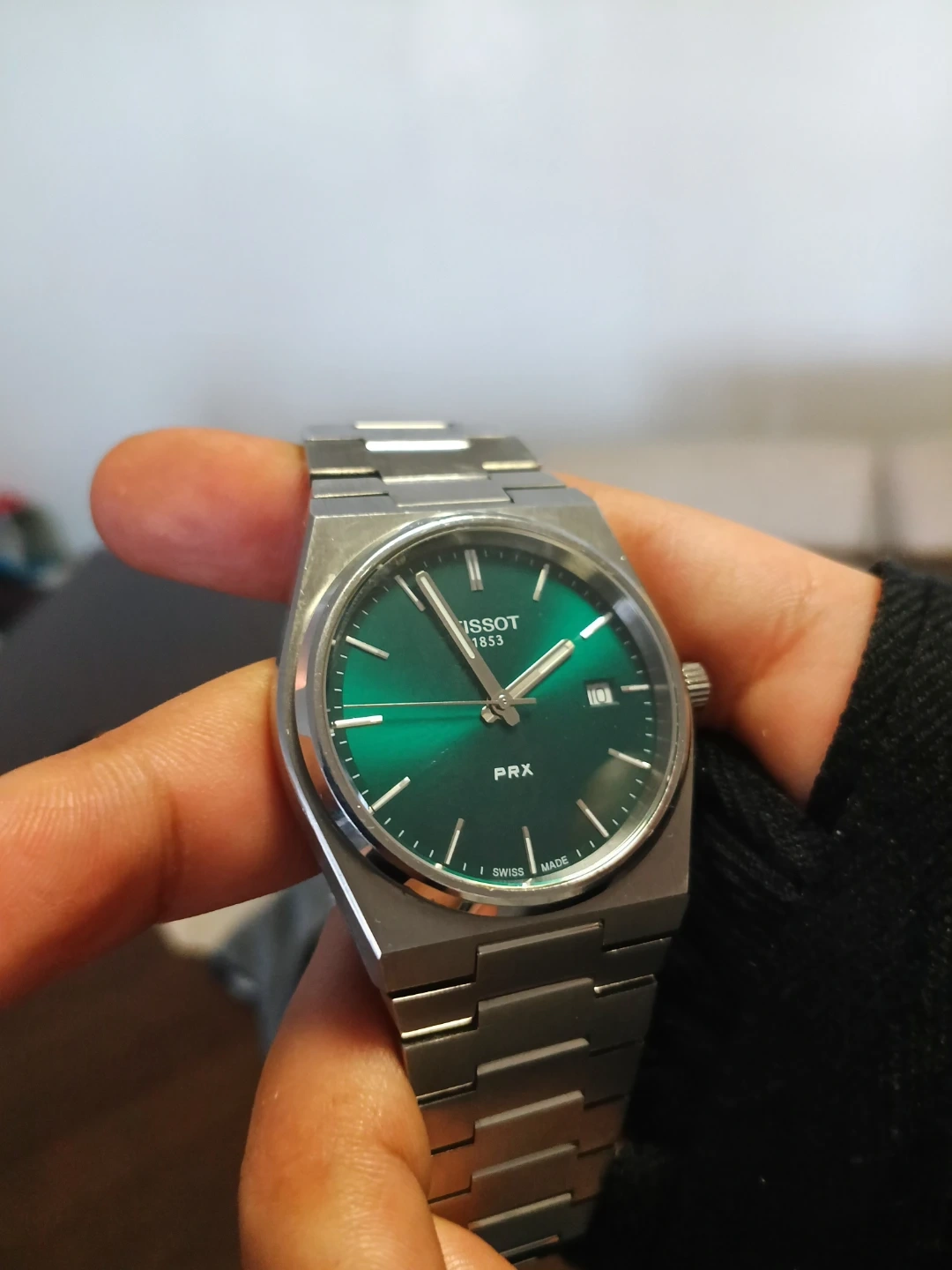 Three men's wristwatches including a Tissot PRX with a green dial, a Fossil chronograph with Roman numerals, and a Rado watch with a patterned face.