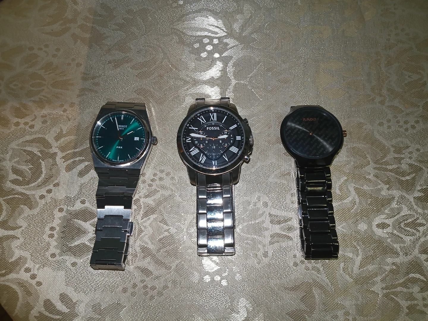 Three men's wristwatches including a Tissot PRX with a green dial, a Fossil chronograph with Roman numerals, and a Rado watch with a patterned face.