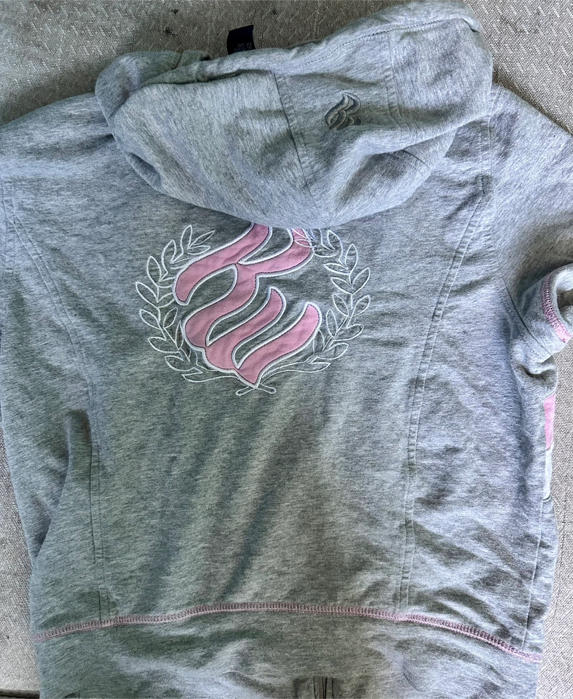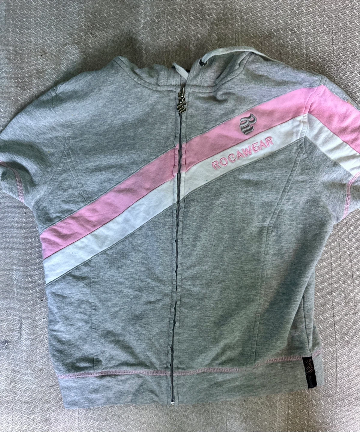 Gray zip-up hoodie by Rocawear with pink and white stripe accents. It features embroidered logos on the front and back. Made from a comfortable blend.