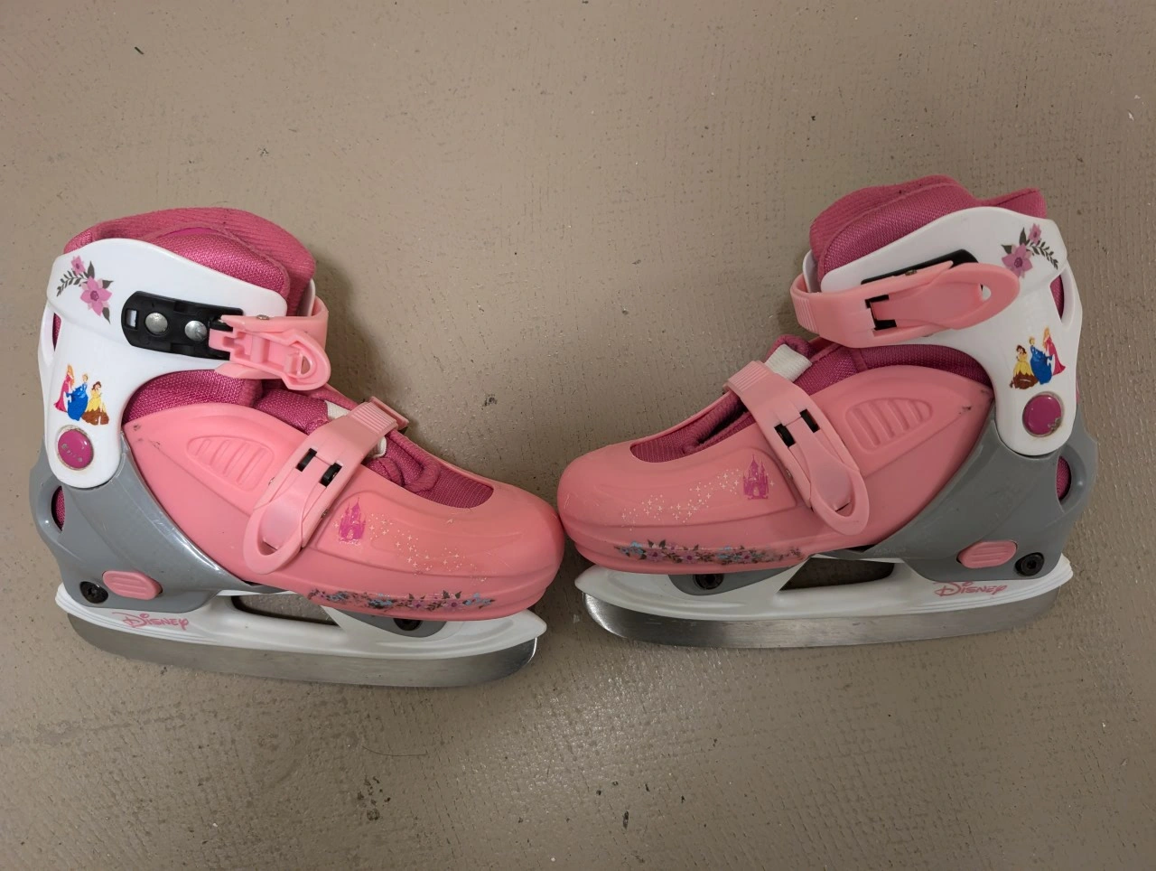 Pink figure skates with Disney princess design. Includes two buckles and a Velcro strap. adjustable Sizes