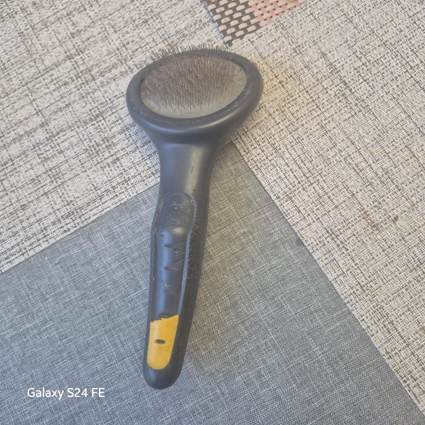 This slicker brush is designed for grooming pets. It features metal bristles to help remove loose fur and tangles. This tool is useful for regular pet grooming to keep coats healthy.