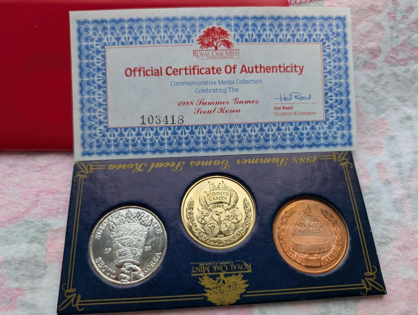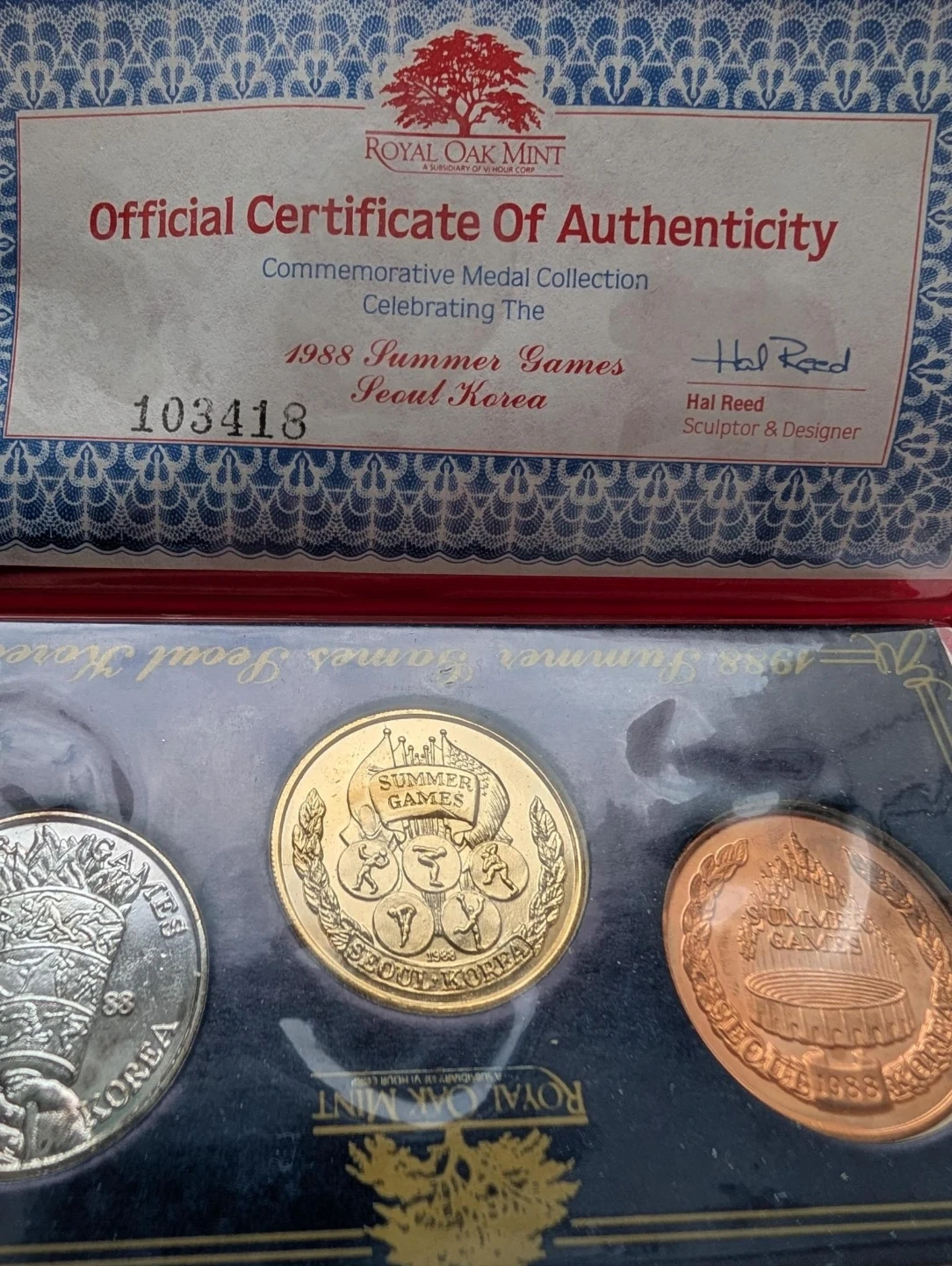This set includes three commemorative medals from the 1988 Summer Games in Seoul, Korea. The collection features medals for Baseball and Tennis, in silver, gold, and copper finishes. A Certificate of Authenticity is included.