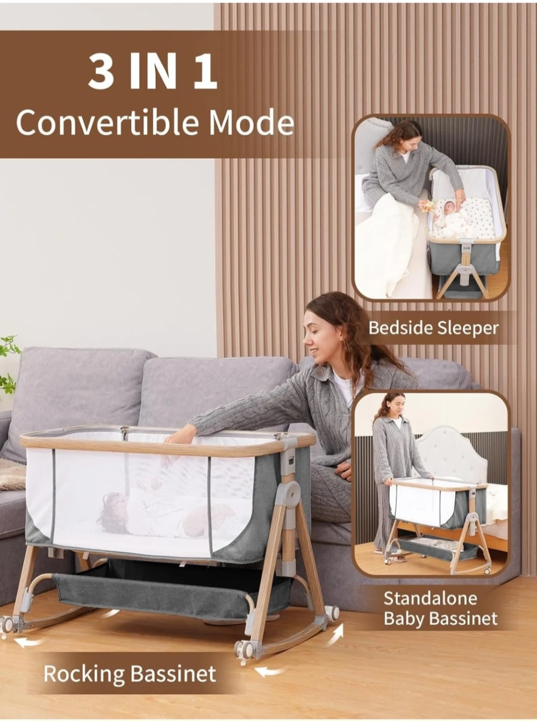 Baby Bassinet Bedside Sleeper - 3 in 1 Bassinets with Waterproof Sheets, Soft Mattress and Breathable Mesh, Adjustable Height Bedside Bassinet for Baby with Wheels, Storage Basket, Gray in color.