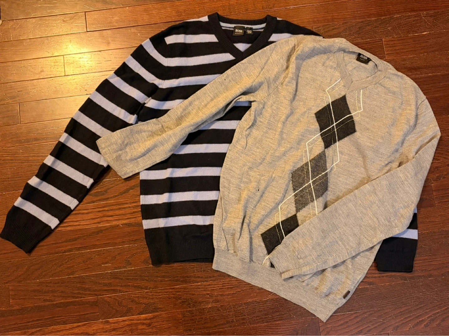 Two HUGO BOSS sweaters. One is grey with an argyle pattern and slim fit. The other is black with blue stripes and regular fit. Both are size medium.