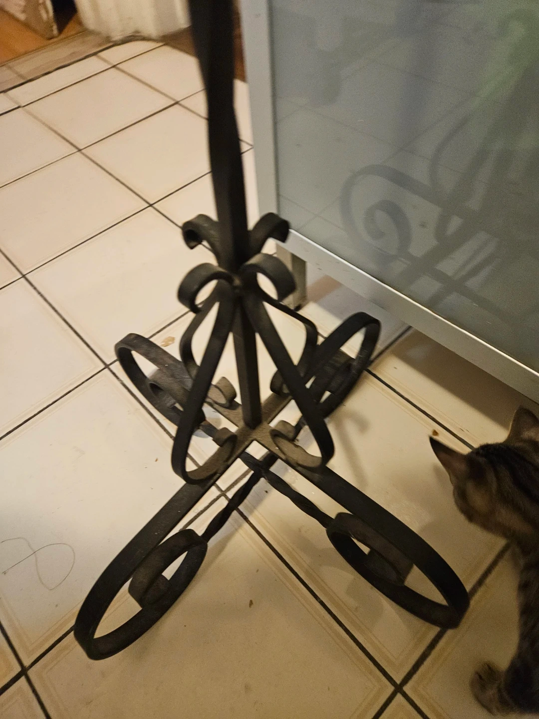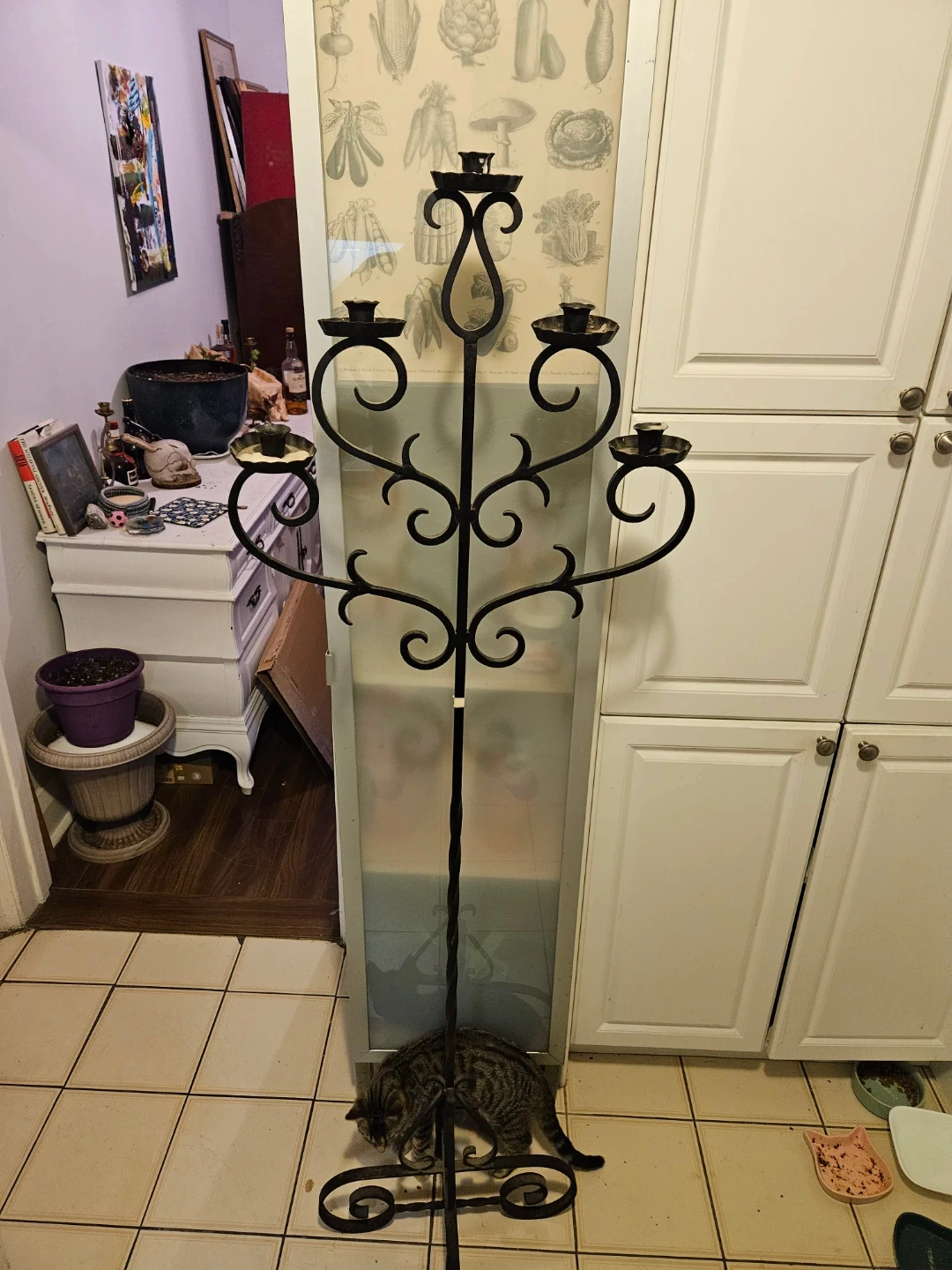 This tall floor candelabra has a decorative wrought iron style. It holds five candles, with three on one side and two on the other. It's a statement piece for any room!asking 80.00 OBO