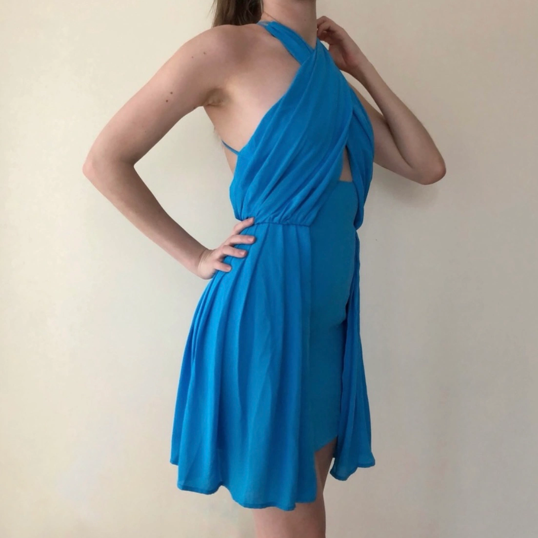 Beautiful light blue mini dress with beautiful criss-cross top detail that drapes over the skirt.