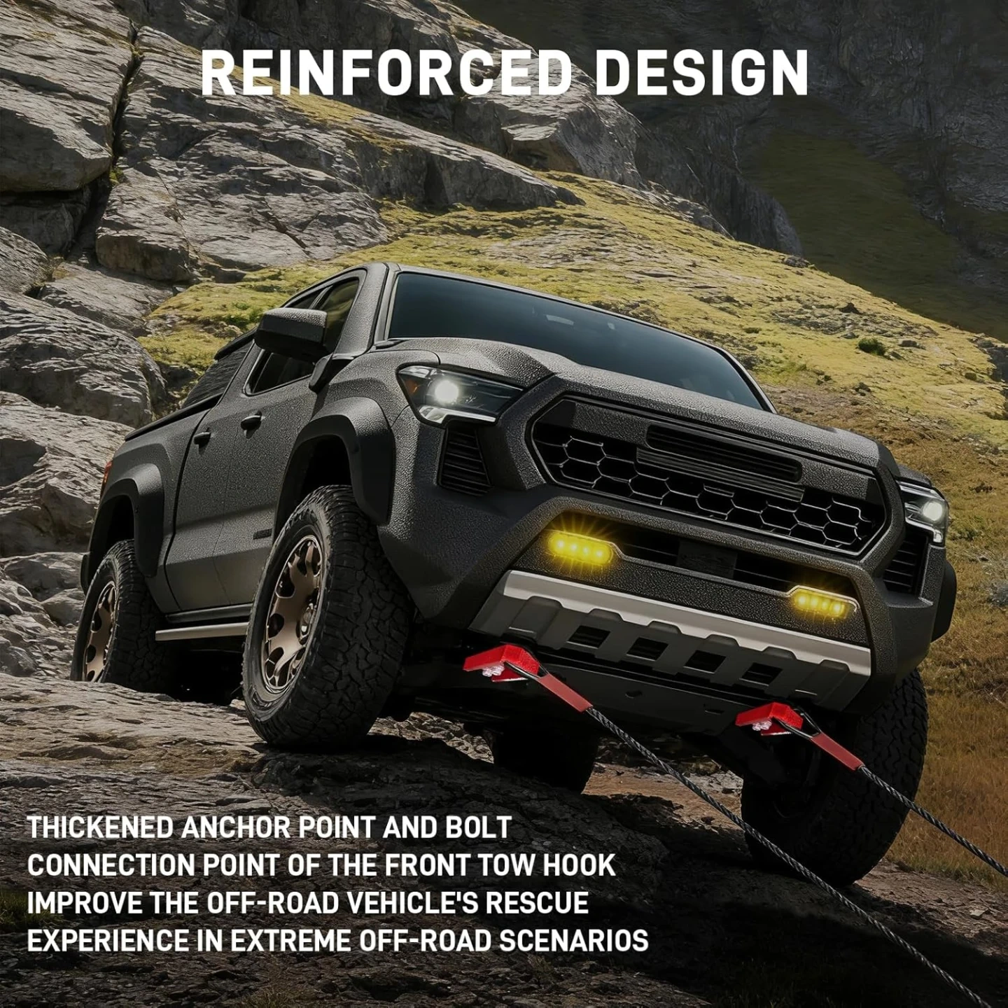 [Reinforced Design]: Thickened Anchor Point And Bolt Connection Point Of The Front Tow Hook Improve The Off-Road Vehicle's Rescue Experience In Extreme Off-Road Scenarios