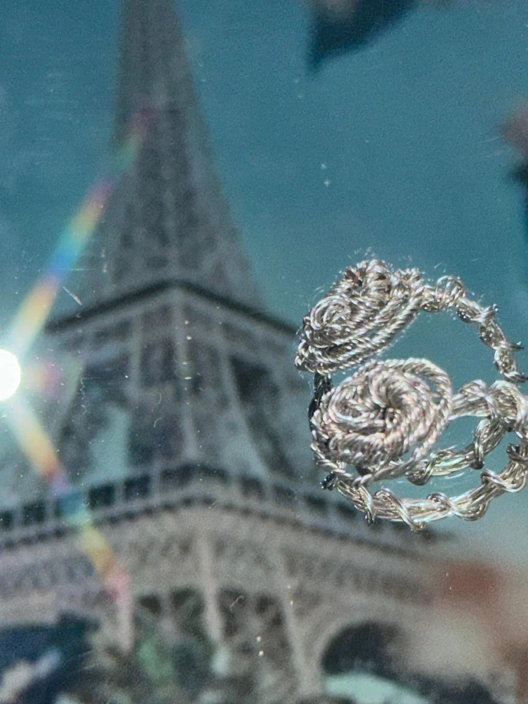 This unique ring features a delicate wire-wrapped design with two rose-shaped elements. It's made from silver-toned wire. This piece adds a touch of handcrafted elegance to any outfit!