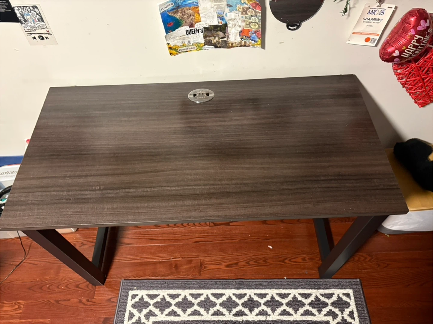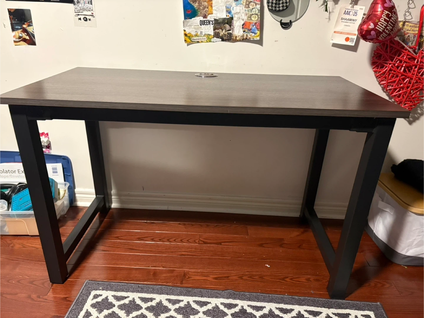 A sturdy desk with a dark wood grain finish and black metal legs. It has a built-in cable management grommet on the surface. This desk is suitable for home offices or study spaces.
