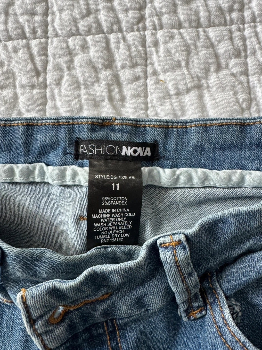 These Fashion Nova jeans feature a distressed flare style. Made from 98% cotton and 2% spandex. size 11 tag. Features split hems for a modern look.