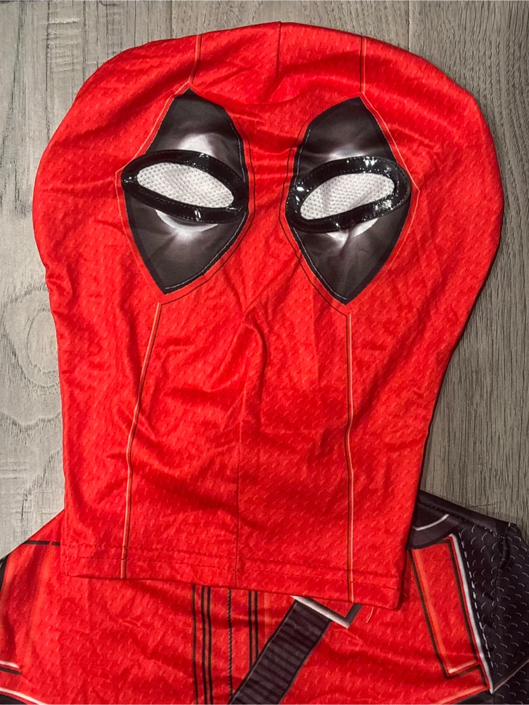 Selling a fun Deadpool costume with mask for kids! It's in great condition and perfect for dress-up or Halloween. The onesie features the classic Deadpool design with mask. Size is suitable for kids 8-12yr, but please check the measurements to ensure a good fit. Let me know if you have any questions!