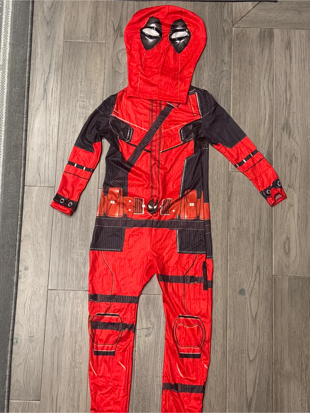 Selling a fun Deadpool costume with mask for kids! It's in great condition and perfect for dress-up or Halloween. The onesie features the classic Deadpool design with mask. Size is suitable for kids 8-12yr, but please check the measurements to ensure a good fit. Let me know if you have any questions!