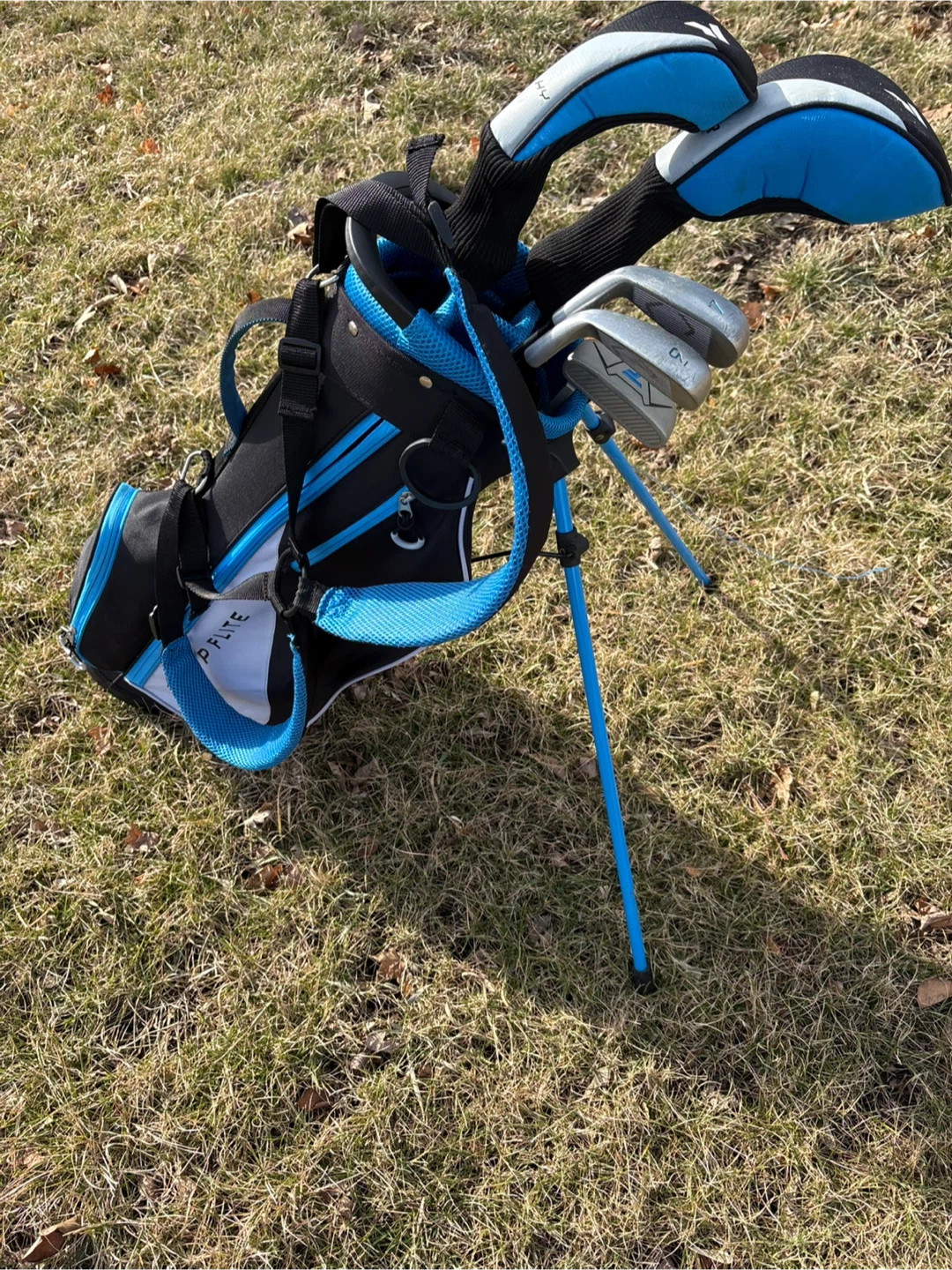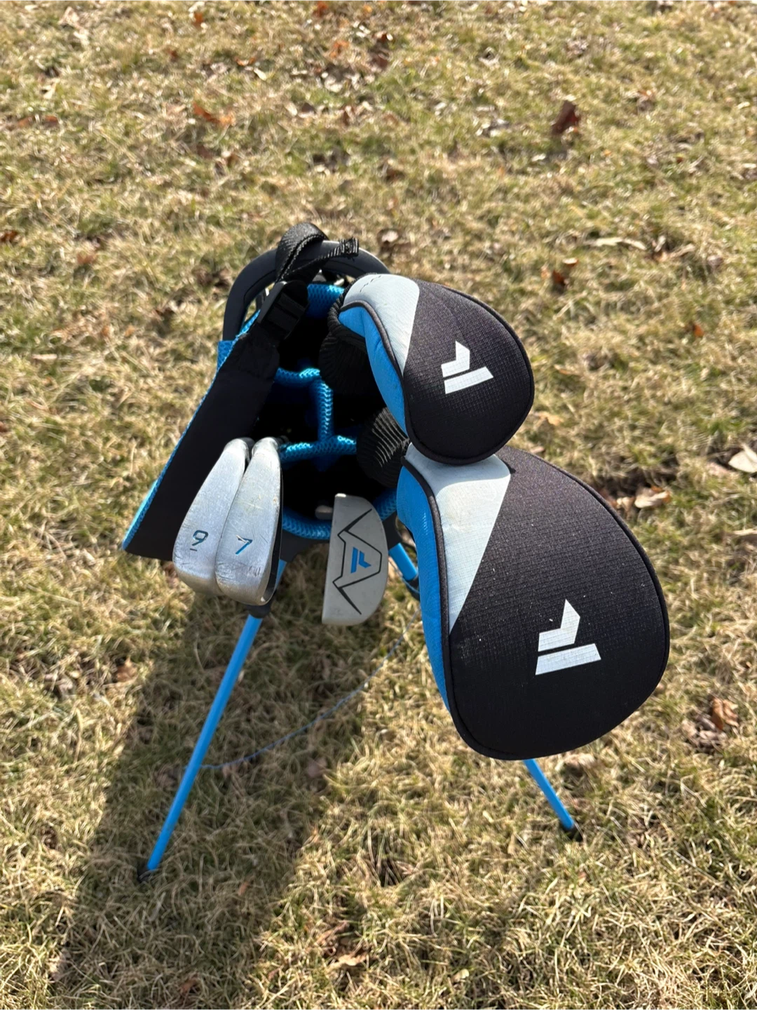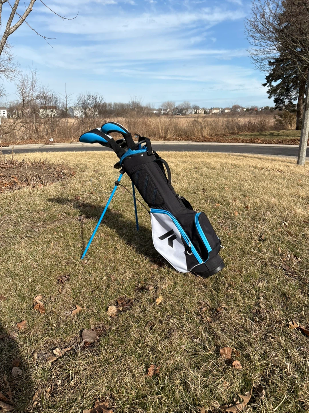 This is a Top Flite golf junior starter set. It includes a lightweight stand bag and several clubs. The bag has a blue and black design with white accents. It's perfect for beginner golfers looking to get started!