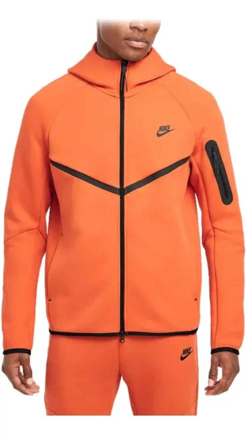 This is a full Nike Tech Fleece zip hoodie in orange. It features the signature chevron design and a zippered arm pocket. Made from a comfortable fleece material for warmth.
