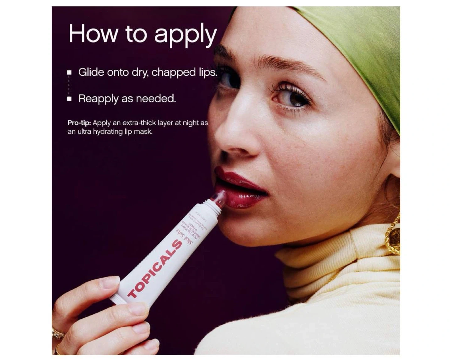 Hydrating TOPICALS Slick Salve Glossy Lip Balm. This is the Acai flavor, perfect for dry, parched lips. It relieves severe dryness and strengthens your moisture barrier. Has long-lasting hydration and soothes discomfort. 100% Vegan + Cruelty free. Contains good stuff like Rice Bran Wax, Hyaluronic Acid, Ceramides, and Glycerin. Comes in a 15 ml / 0.5 fl oz tube.