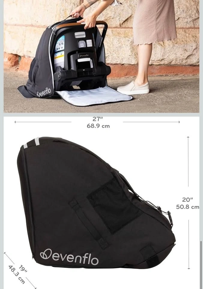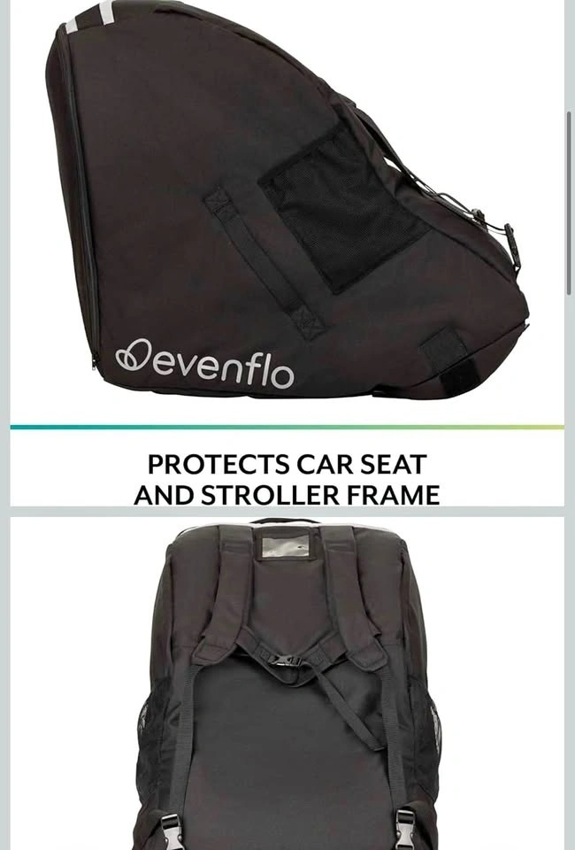 Lightweight padded polyester travel bag. Backpack style straps with chest clip for comfortable carrying. Strong chrome zipper for easy loading. Wheel access flaps for easy airport rolling. Top carry handle for quick pickup. Includes 2 mesh side pockets, luggage tag & drawstring storage bag. Perfect for protecting your Evenflo Shyft DualRide stroller during travel.