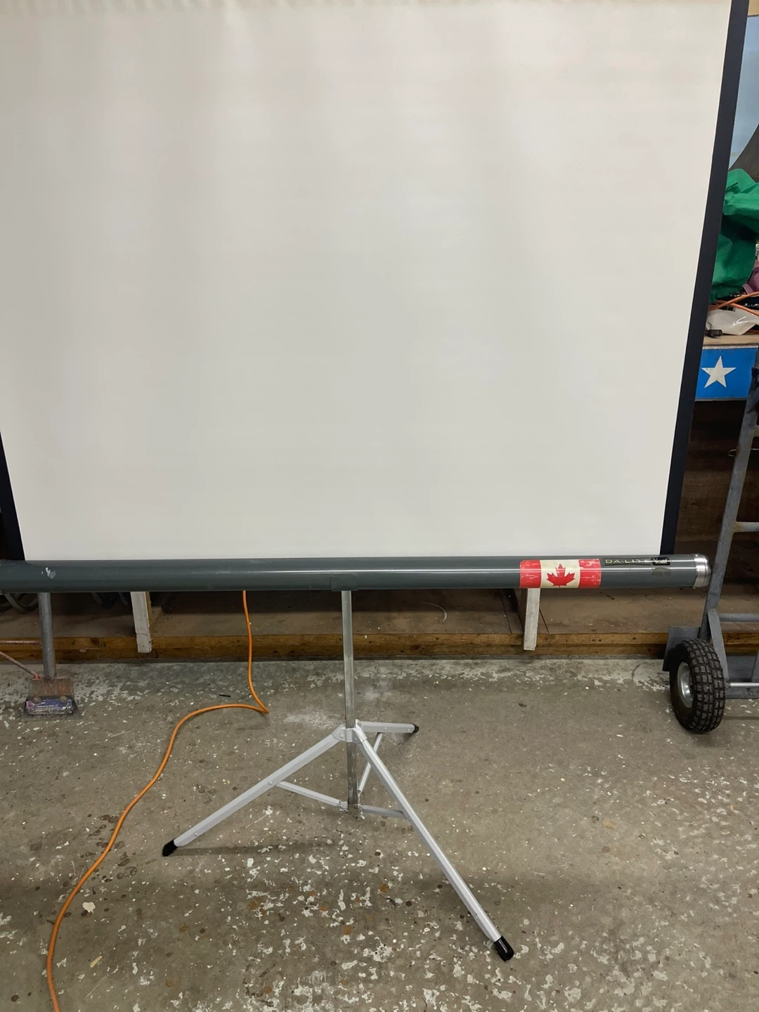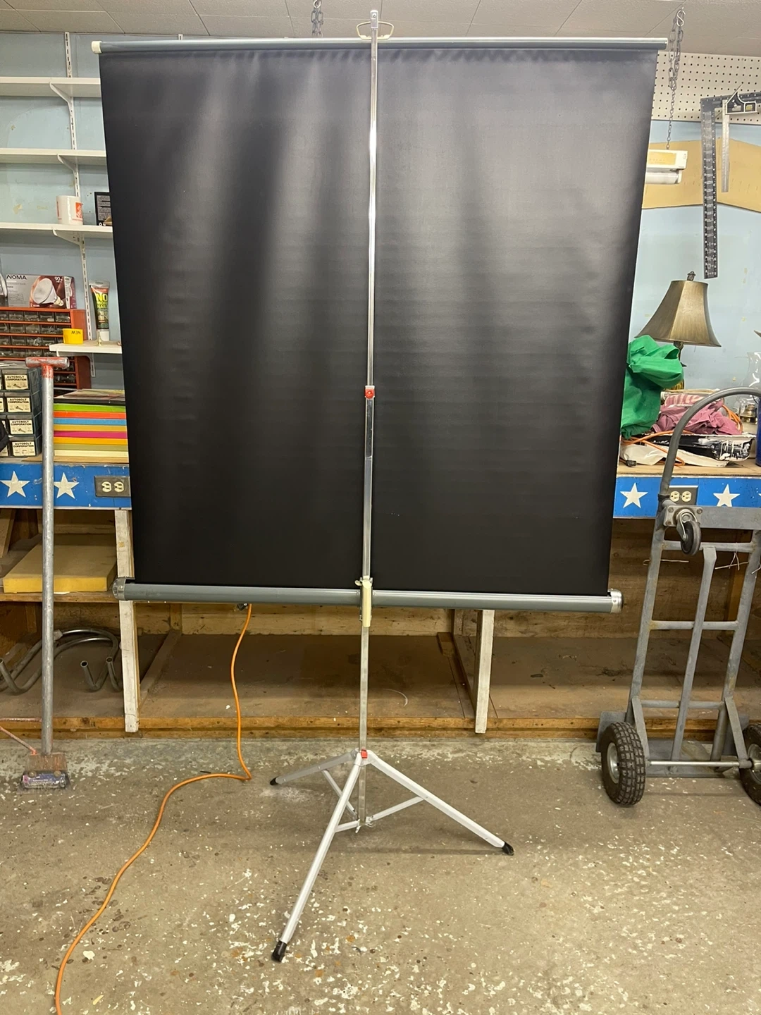 This portable tripod projector screen is easy to set up and take down. It offers a clear display surface for presentations or movie nights. The screen itself is black on one side and white on the other, providing versatility. 50” wide and adjustable up to 50” high. Cash only