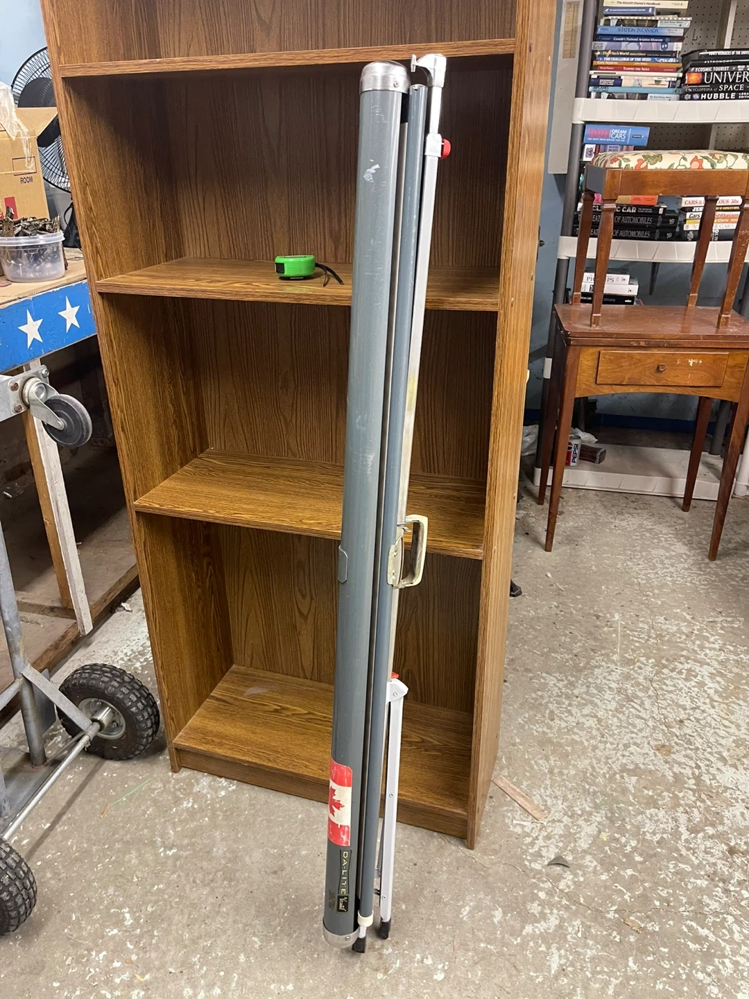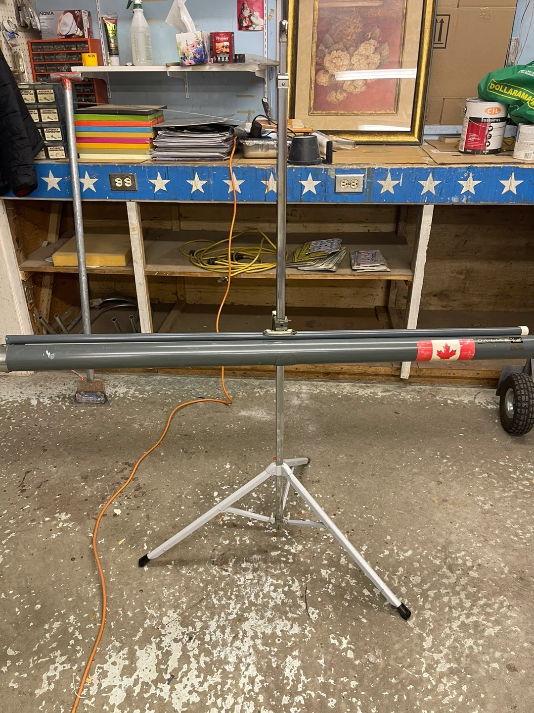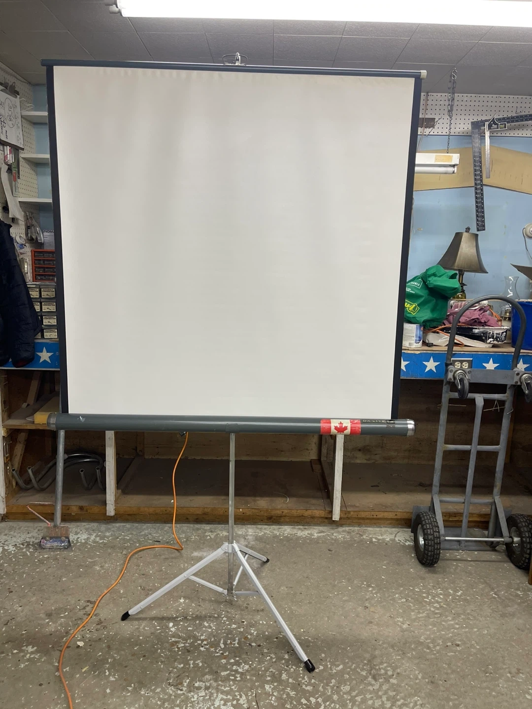 This portable tripod projector screen is easy to set up and take down. It offers a clear display surface for presentations or movie nights. The screen itself is black on one side and white on the other, providing versatility. 50” wide and adjustable up to 50” high. Cash only
