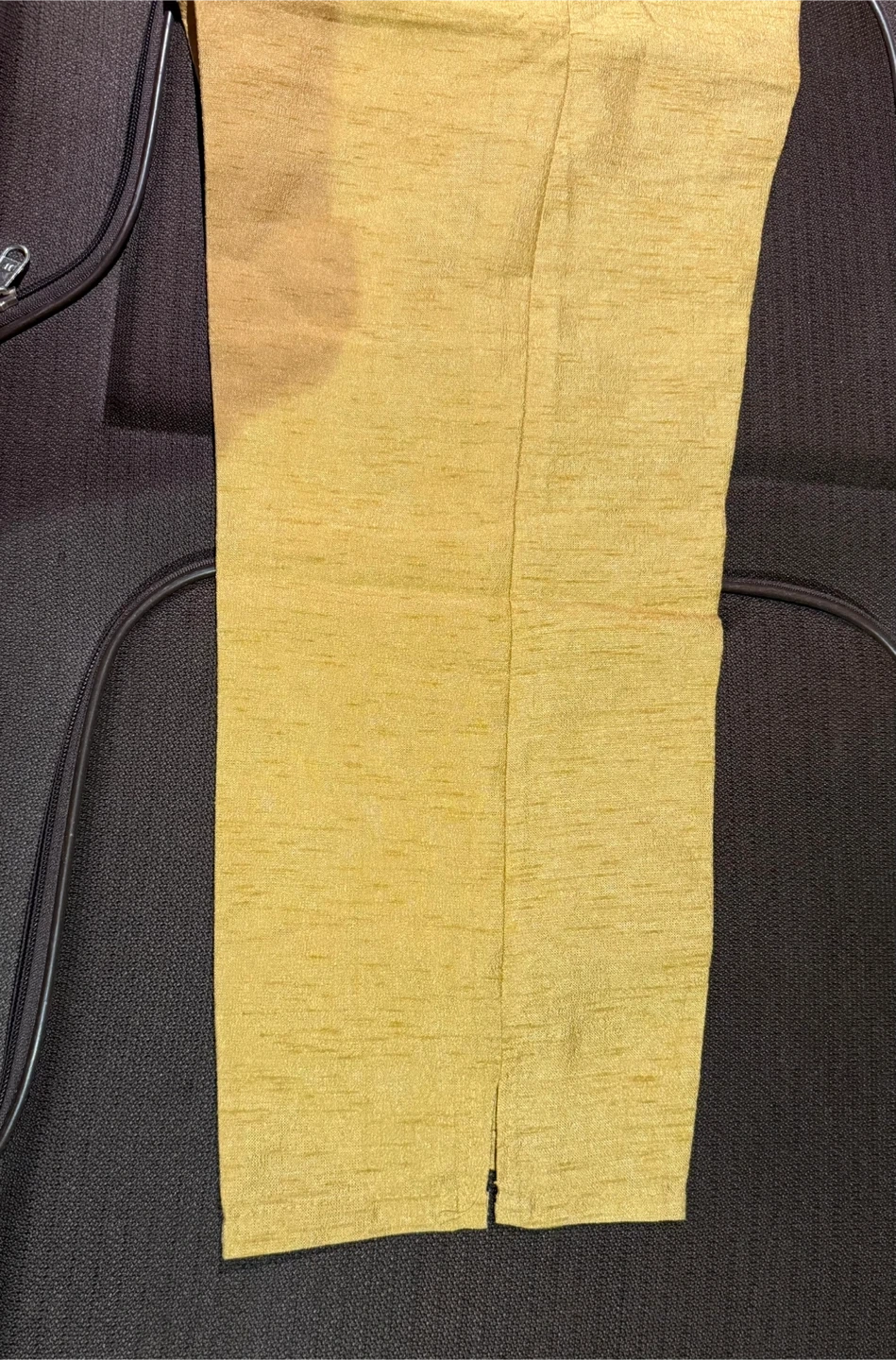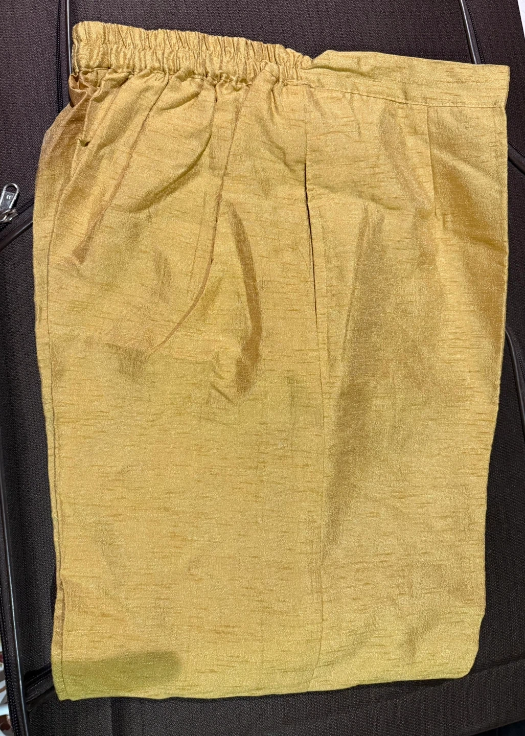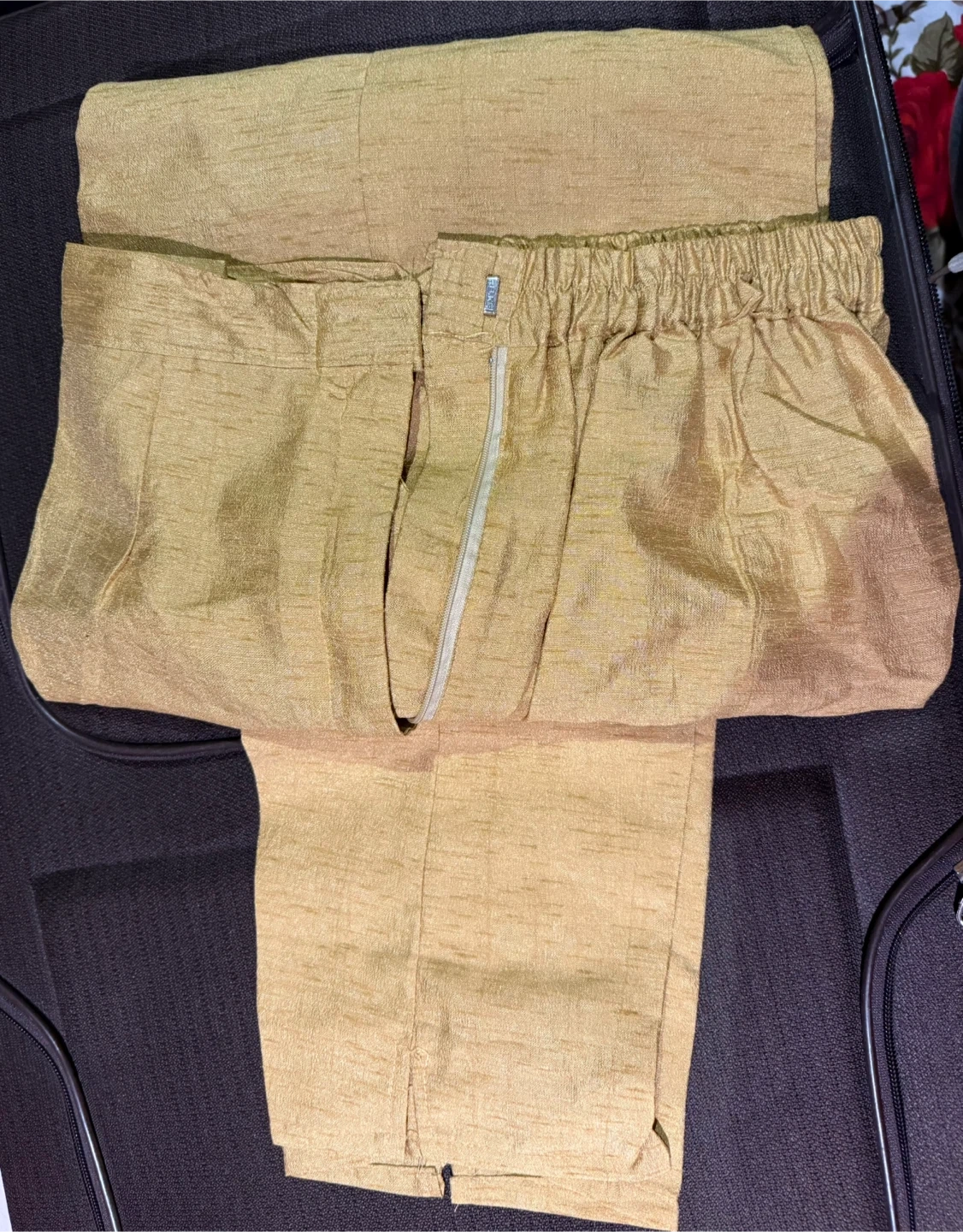 Selling a pair of gold-coloured straight pants. They have an elastic waistband. There is a stain on the pants which is just a style.