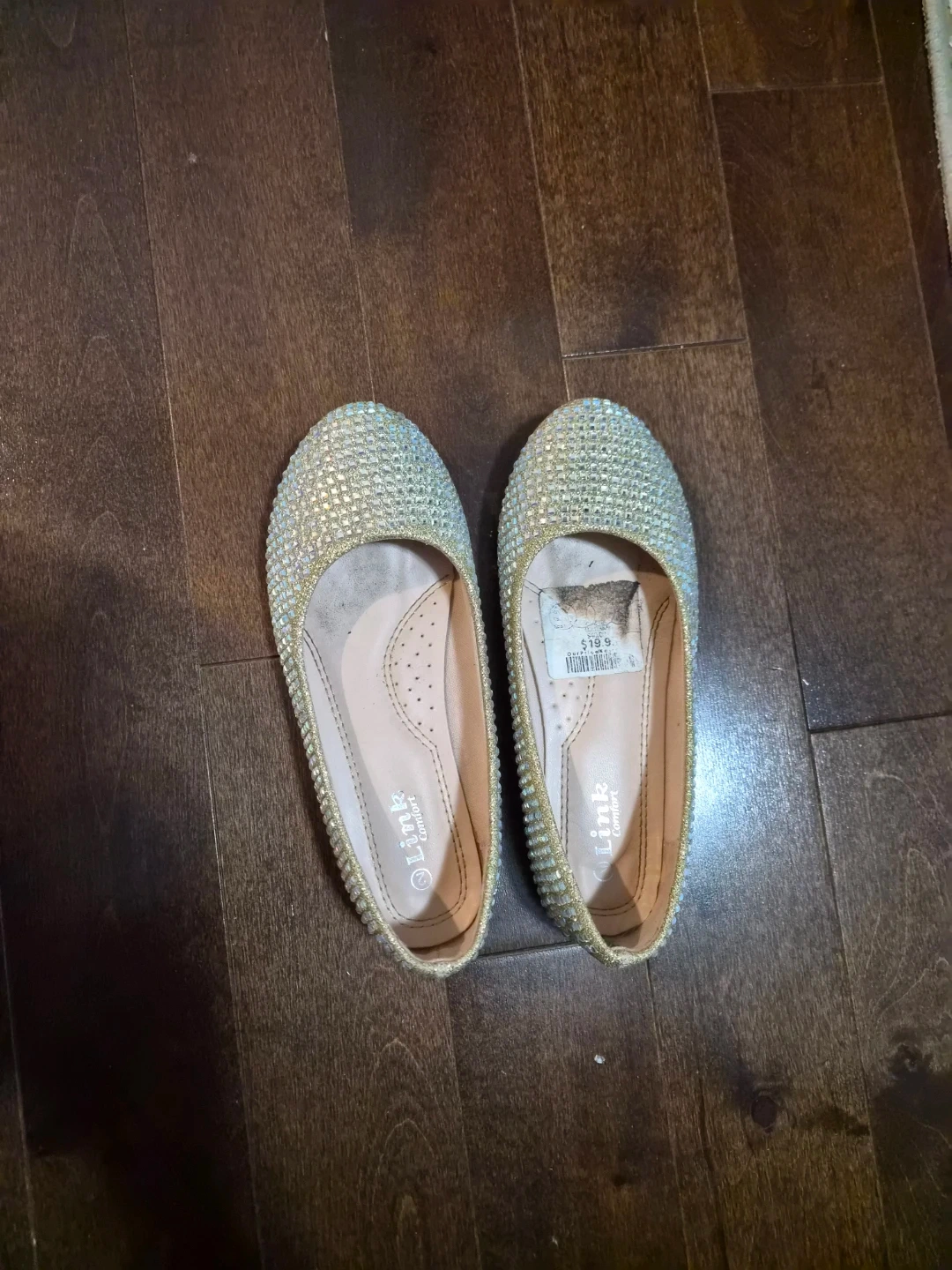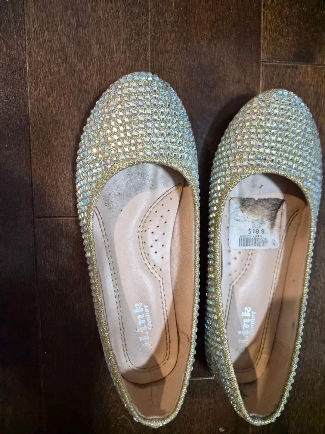 Sparkly ballet flats embellished with rhinestones. They're a size 7.5. These flats offer a touch of glam for any occasion!