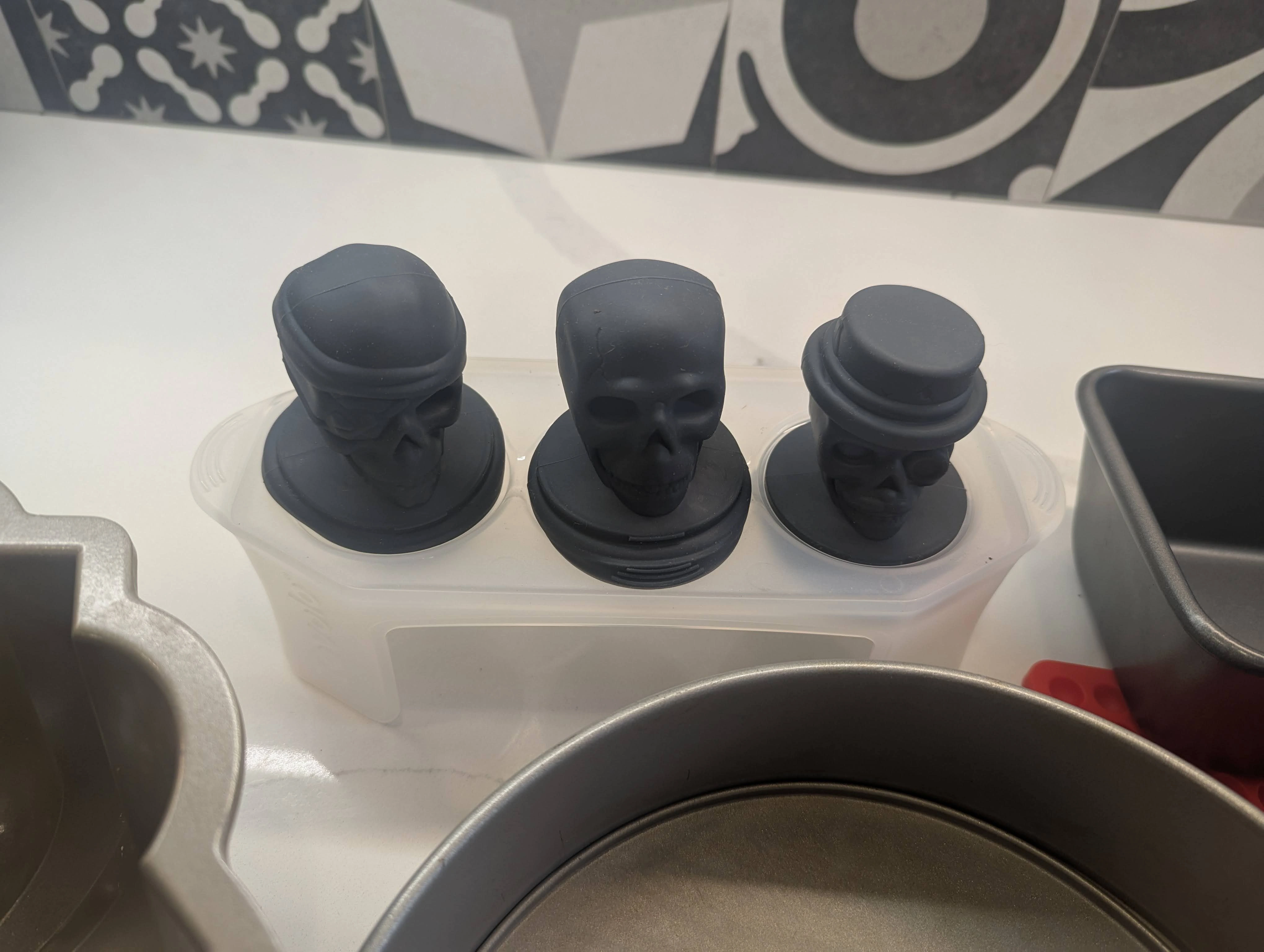 Three skull-shaped silicone molds for ice, chocolate, or candy